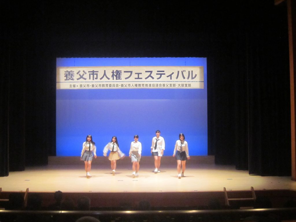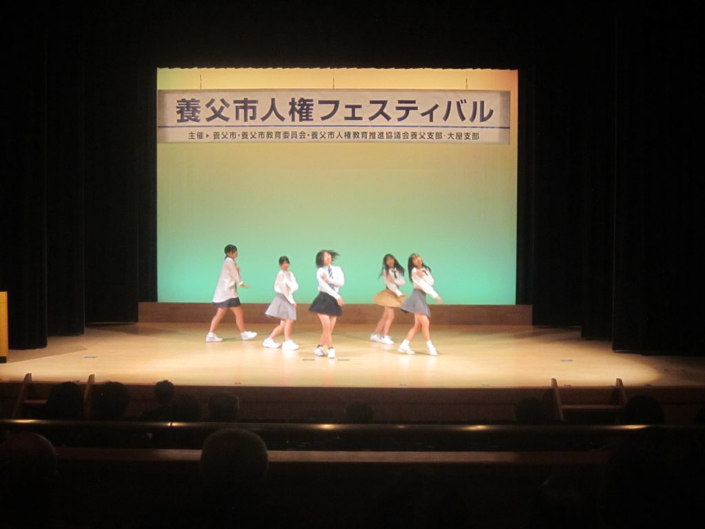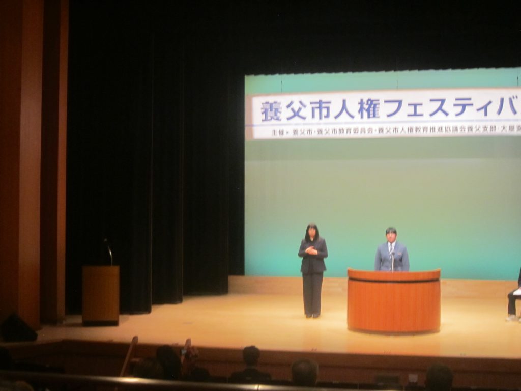 11月28日(金)に、養父市の養父地区と大屋地区を対象とした「養父市人権フェスティバル」がビバホールで開催されました。この行事は、「いつでもどこでも当たり前のように人権尊重の意識があふれるまちをめざして、普段の何気ない行動や発言の中で人権尊重の視点に立って語り合えるように・・・」を趣旨としています。養父中学校からは、生徒代表が人権作文を発表してくれましたし、アトラクションとしてダンスを披露してくれた生徒も居ました。講演では、交通事故で右腕を失いながらも、水泳でパラリンピックに4度出場している伊藤真波さんが、「あきらめない心」という題目によるお話とともにバイオリン演奏を聴かせてくださり、会場に感動の拍手が響きました。なお、この行事では、広谷小学校、大屋小学校、大屋中学校の児童生徒も堂々と人権作文を発表してくれました。