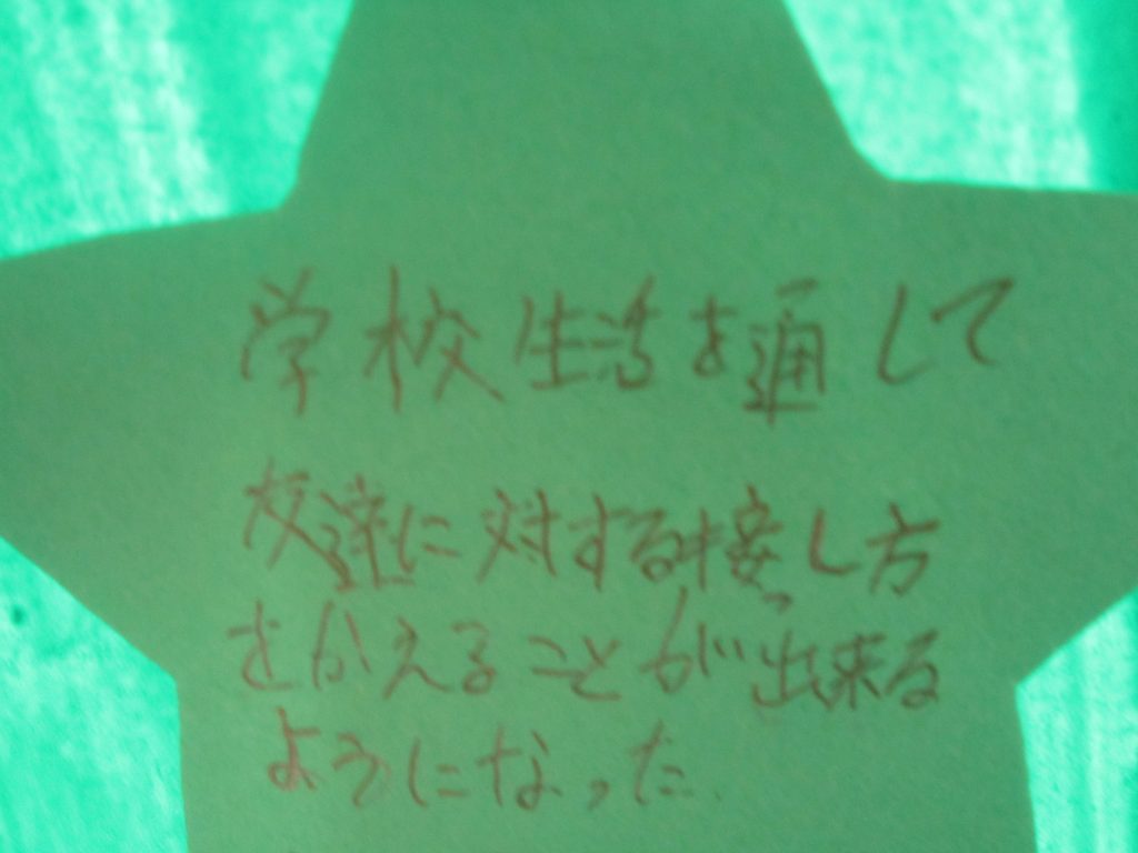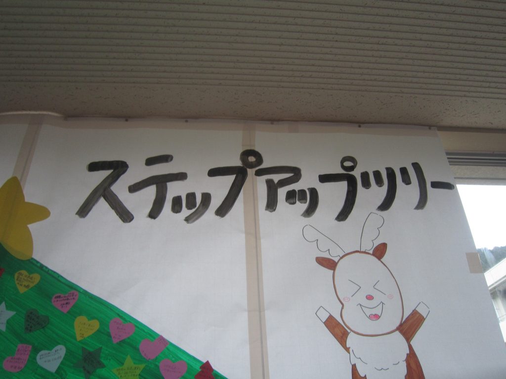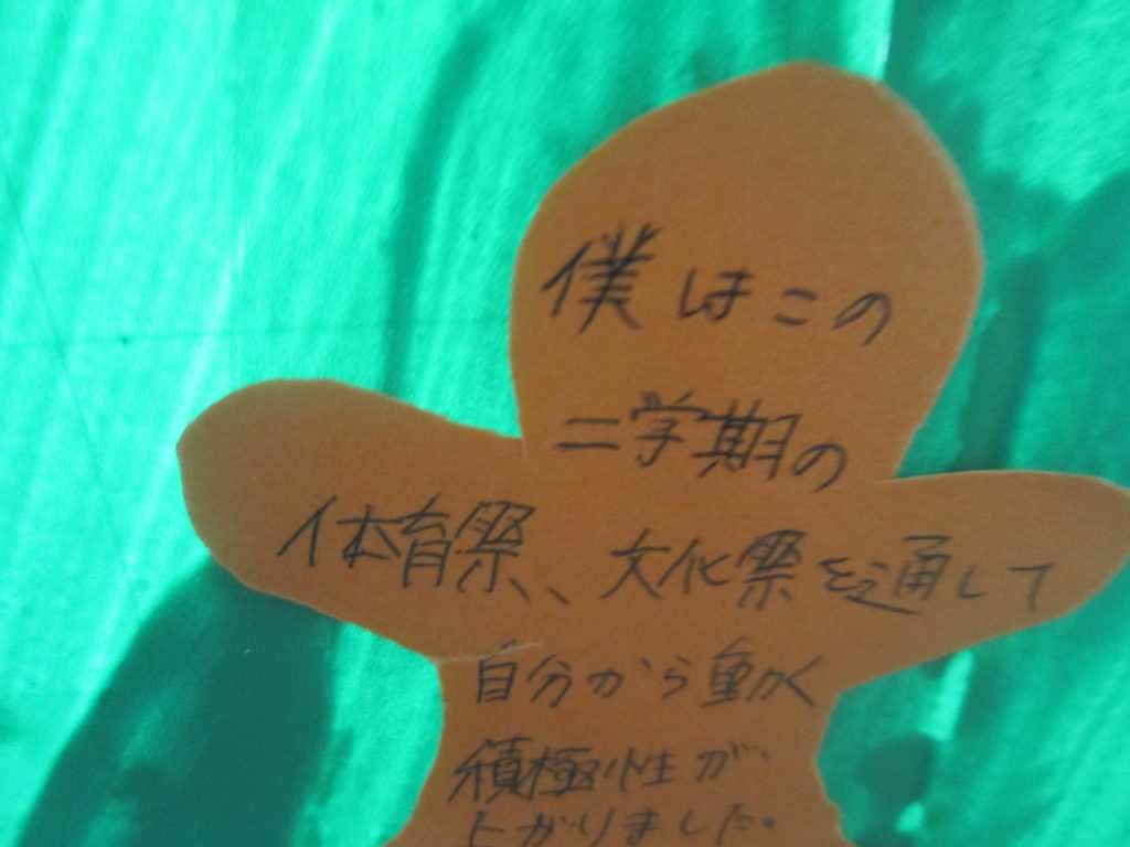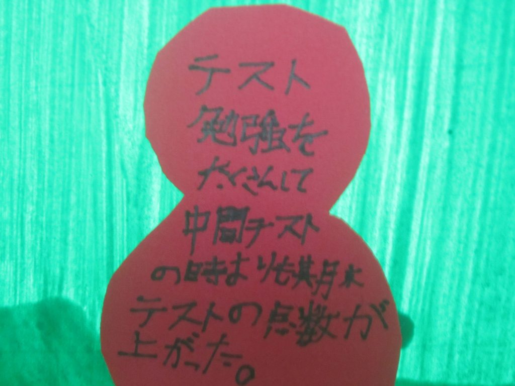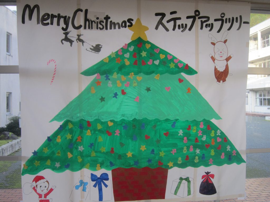 養父中学校の生徒玄関に巨大なクリスマスツリー絵画が登場しました。これは「ステップアップツリー」と呼ばれるもので、生徒会役員の面々が生徒会プロジェクトのために制作しました。この企画では、全校生がツリーの枝に2学期における自らの成長の跡を記すということのようで、すでにさまざまな言葉が貼り付けられていました。長かった2学期もあとわずかです。