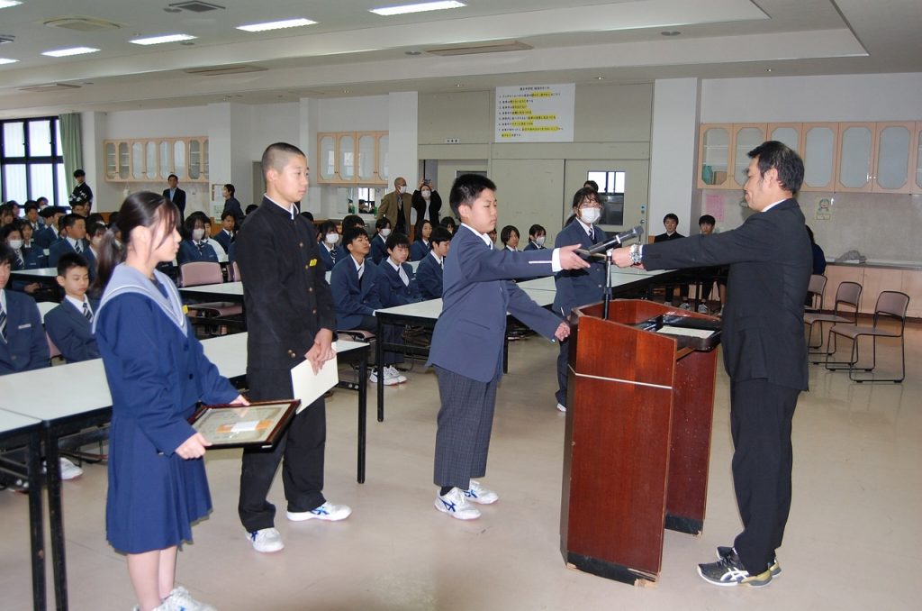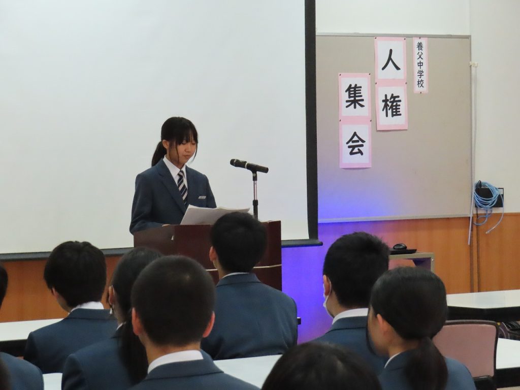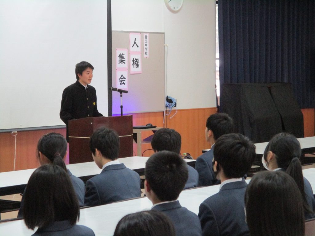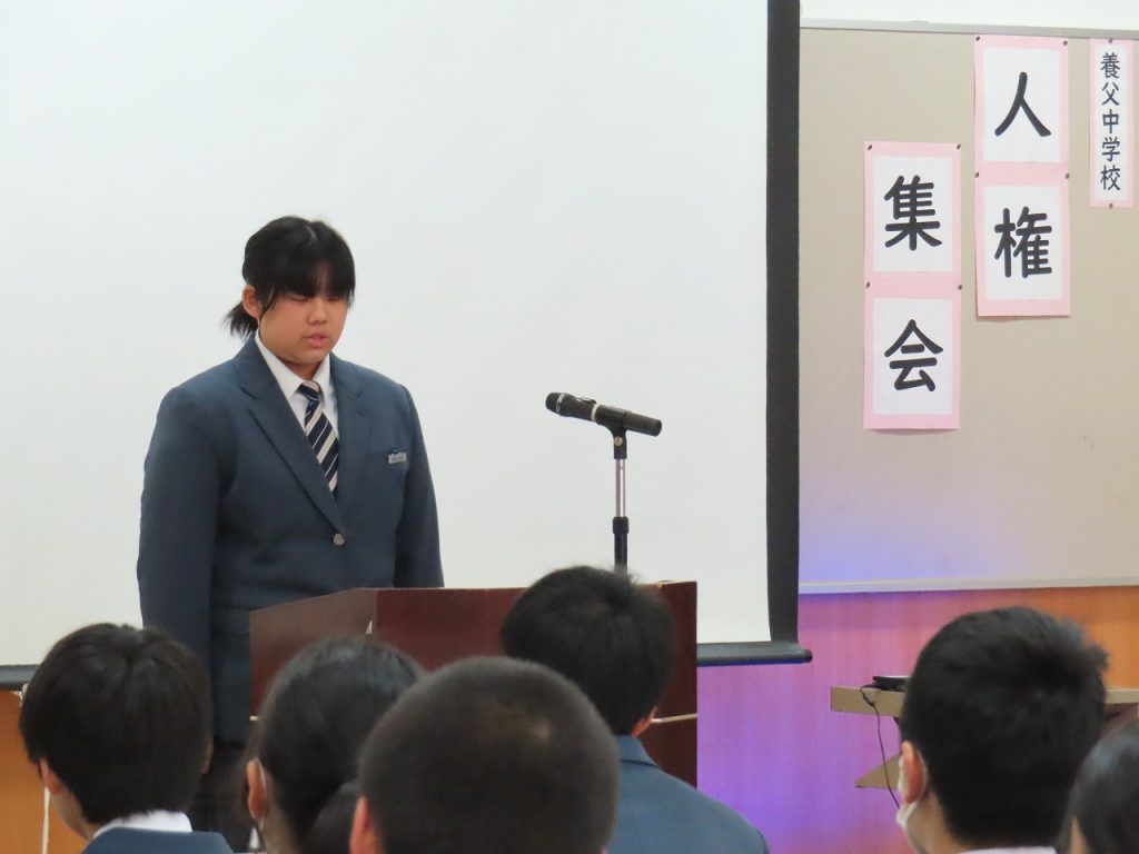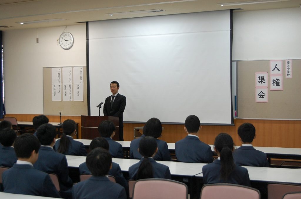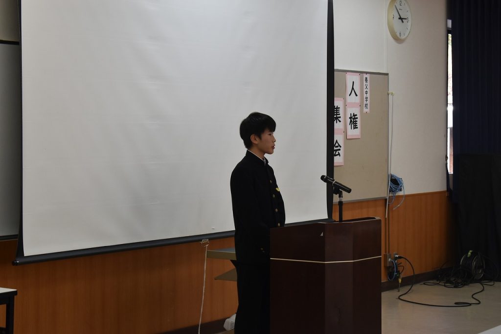 12月9日(火)、5・6校時に養父中学校伝統の人権集会が開催されました。生徒会長の挨拶から始まり、それぞれの学年を代表して3名の意見発表がありました。3名の発表からは人権に対する強いメッセージ、あるいは、強い思いが伝わってきました。その後、各種人権関係コンクールで入賞した生徒への表彰が行われました。最後に、「ほんとの空」というタイトルの人権啓発DVDを鑑賞しました。DVD鑑賞を通して、嘘やデマの拡散・風評被害の怖さを感じながら、イメージや偏見について深く考えることができました。今日の人権集会は人権意識の向上につながるたいへん貴重な機会になりました。