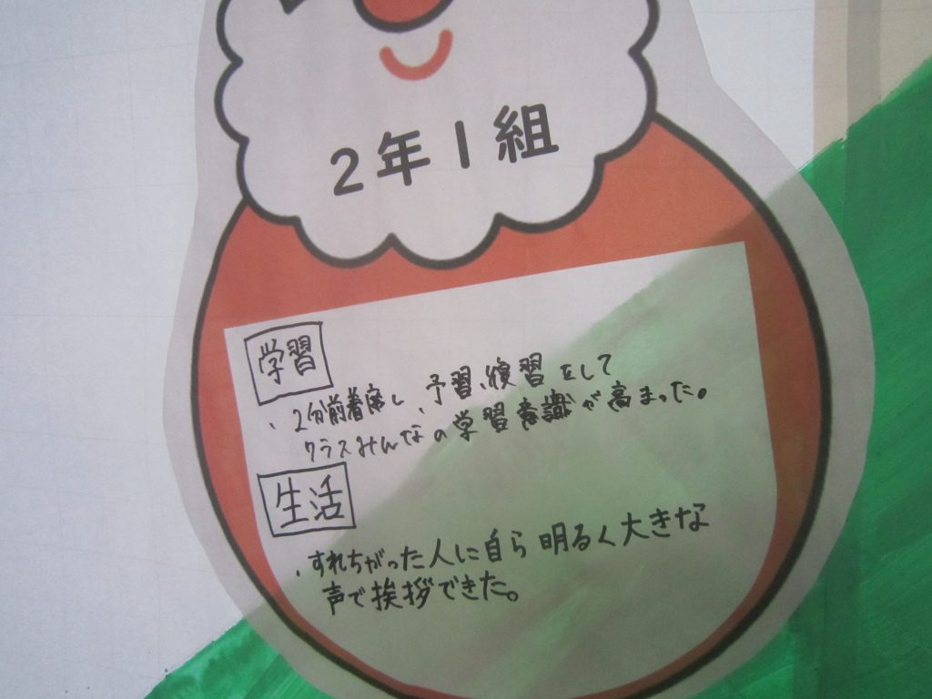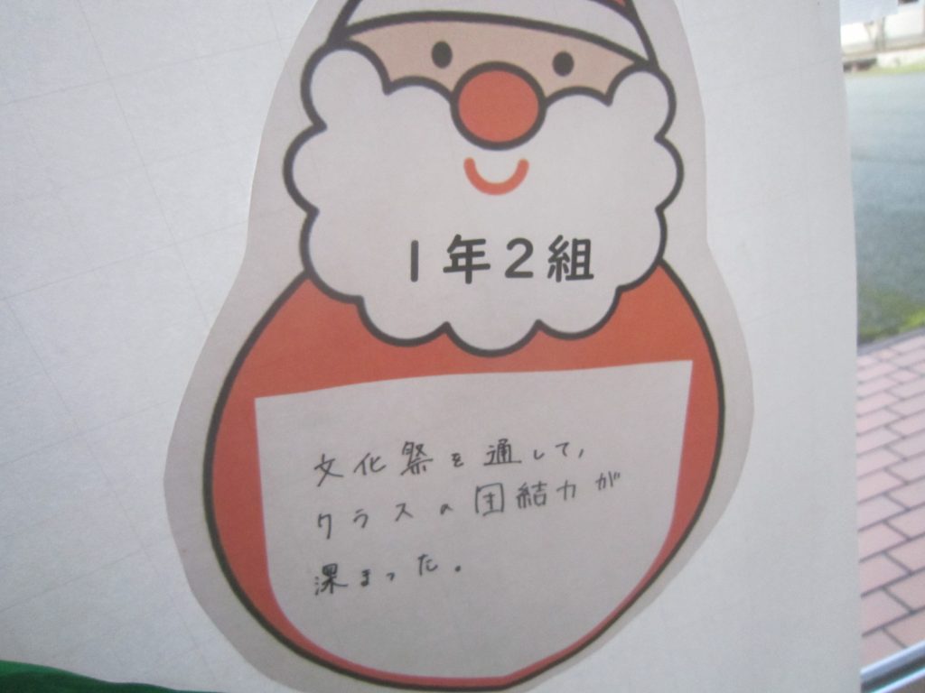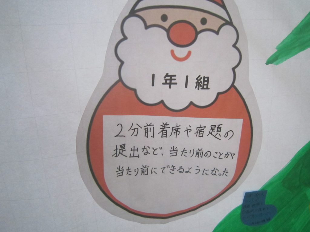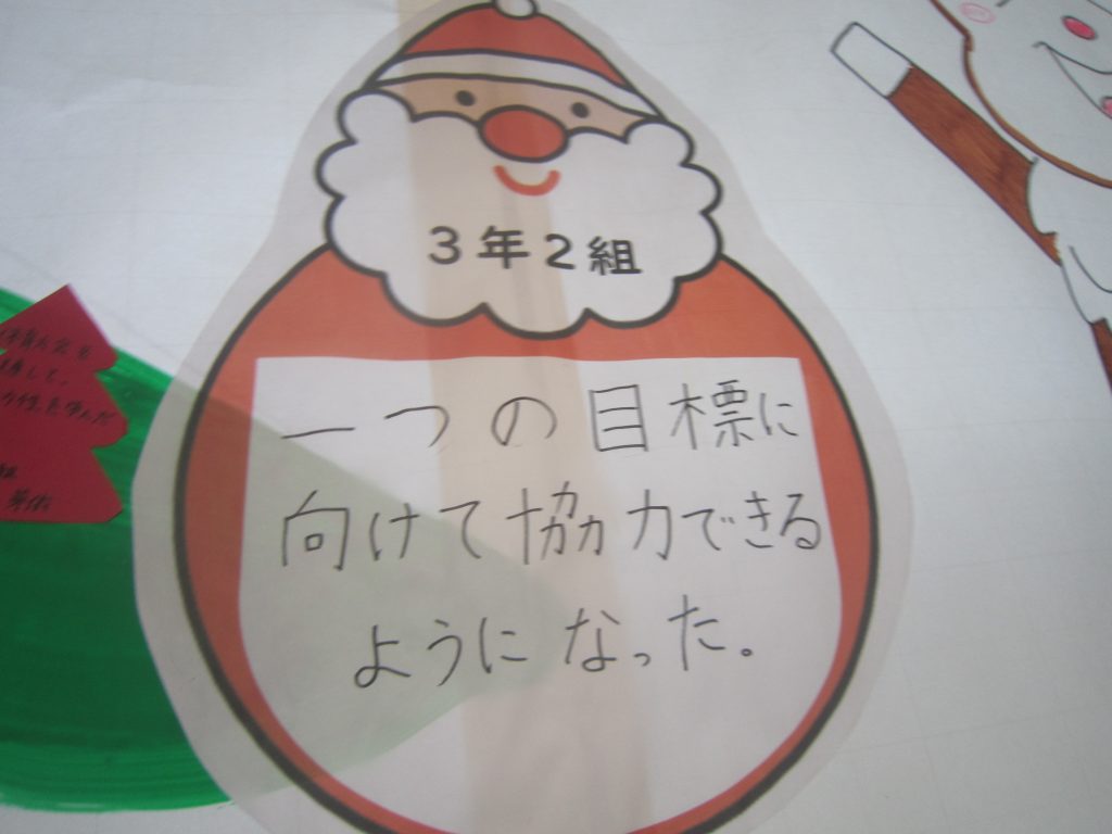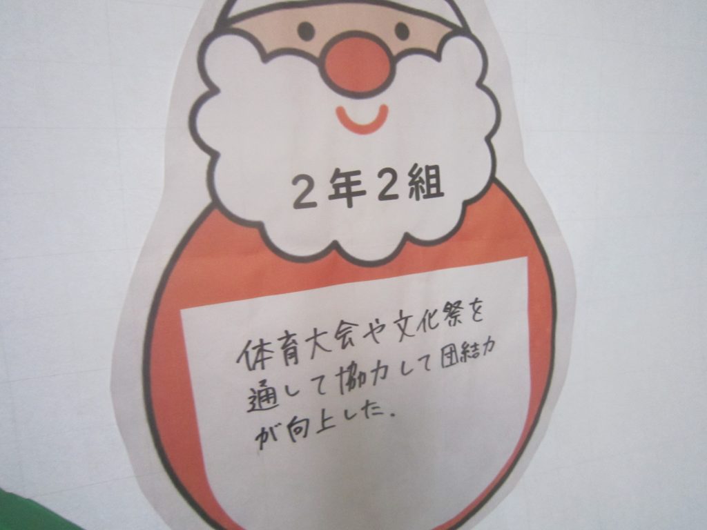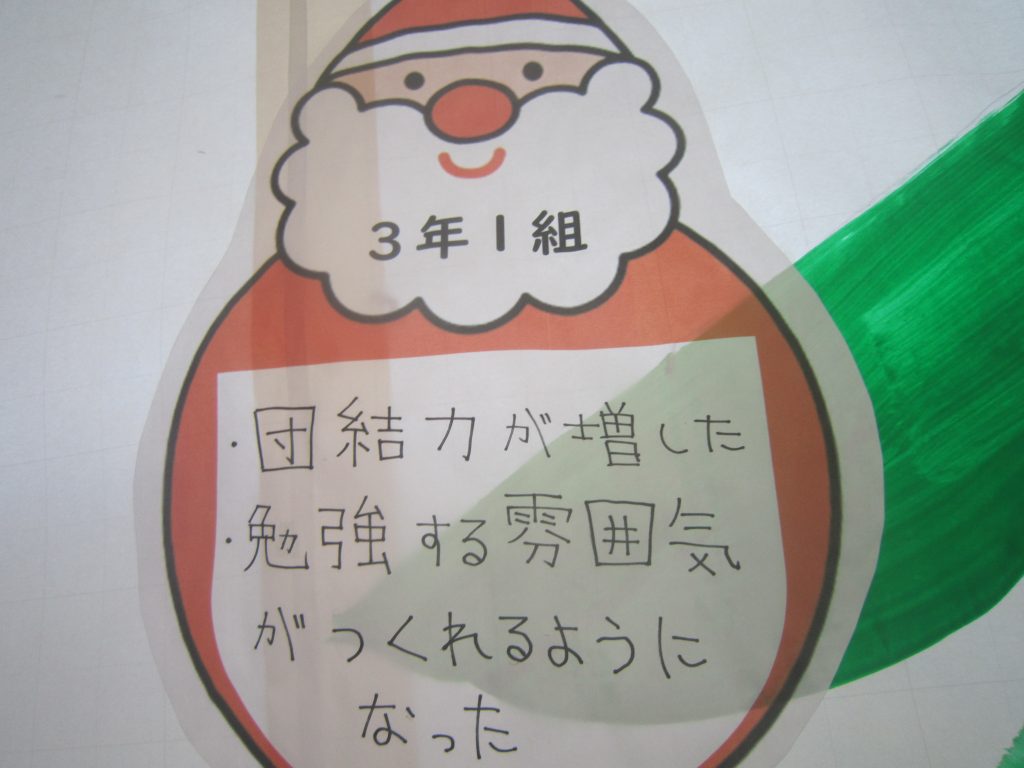 12月8日(月)のトピックスで「養父中学校の生徒玄関に巨大なクリスマスツリー絵画が登場しました。これは『ステップアップツリー』と呼ばれるもので、生徒会役員の面々が生徒会プロジェクトのために制作しました。この企画では、全校生がツリーの枝に2学期における自らの成長の跡を記すということのようで、すでにさまざまな言葉が貼り付けられていました。」と紹介しましたが、その後、各学級の“成長の跡”も掲げられており、思わず写真に収めました。12月8日(月)の生徒集会で校長より話したように、自分たちの成長を実感できるのが学校の“楽しさ”のひとつです。