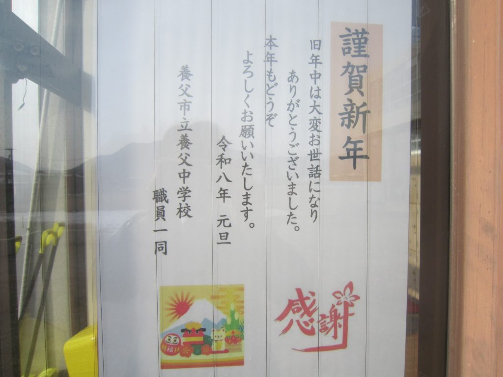 1月5日(月)、養父中学校の令和8年がスタートしました。とは言っても第3学期の始業式は2日後の1月7日(水)ですから、校内はまだ静寂に包まれています。年末年始に降った雪もずいぶんと少なくなりました。あらためまして、新年あけましておめでとうございます。旧年中はたいへんお世話になりました。本年も温かいご支援の程よろしくお願いいたします。養父中学校の生徒、教職員一丸となって頑張ります。