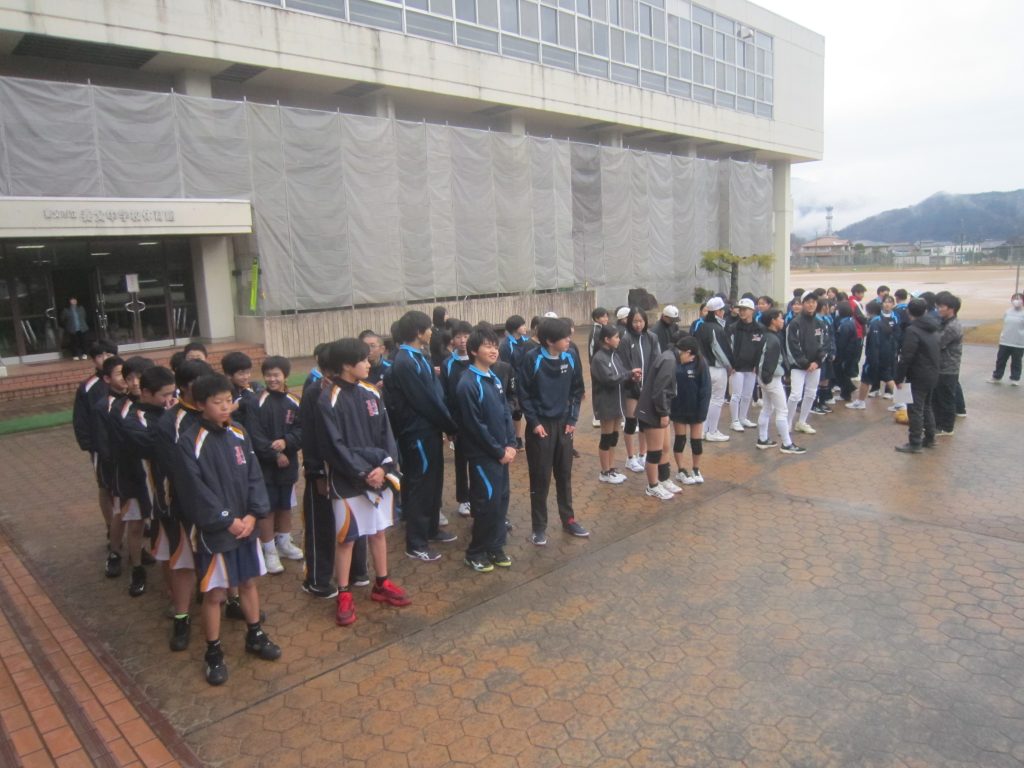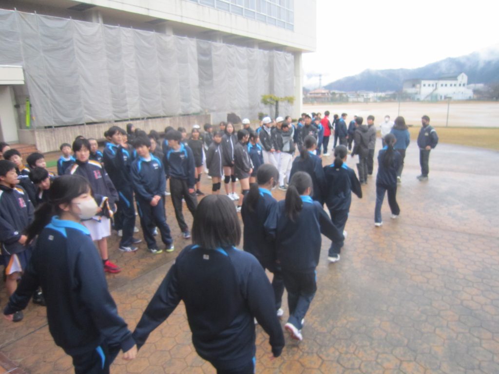 始業式を翌日に控えた1月6日(火)、部活動のために多くの生徒が登校してきました。表情や動きを見ていると、どの生徒も元気そうで練習にも気合いが入っている様子でした。ところが、10時18分頃、鳥取県西部や島根県東部付近を震源とする大きな地震が発生し、養父市では震度3を記録。教頭による校内放送でどの部も即座に部活動を休止し、屋外に一次避難することにしました。しばらくその後の余震の様子を見ていましたが、やや揺れが弱まってきましたので、今度は体育館へ入って二次避難。そして、安全に十分に留意したうえで10時50分頃から部活動を再開することにしました。この一連の動きを見ていると、生徒たちは教職員の指示をしっかりと聞きながら冷静に対応し、たいへんたのもしく思いました。日頃の避難訓練の成果を感じた始業式前日になりました。さあ、明日から3学期。全校生が元気に登校してきますように。