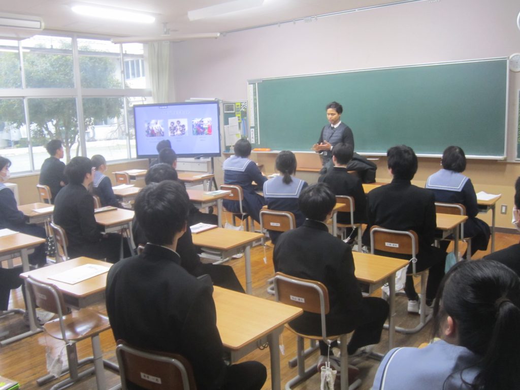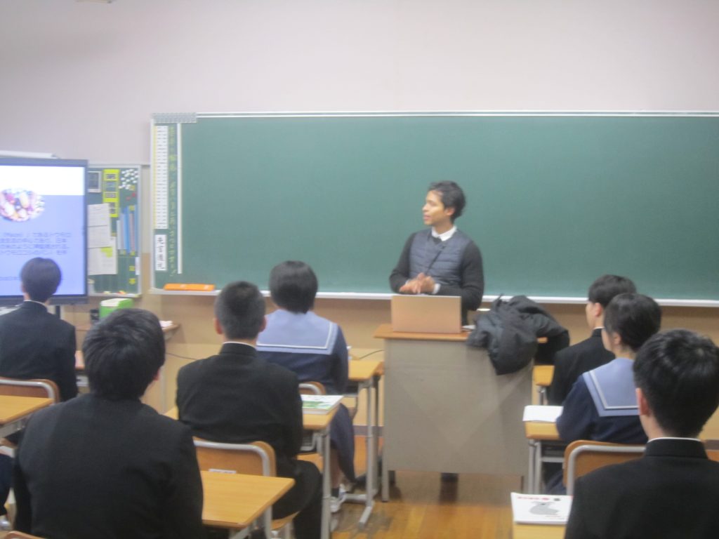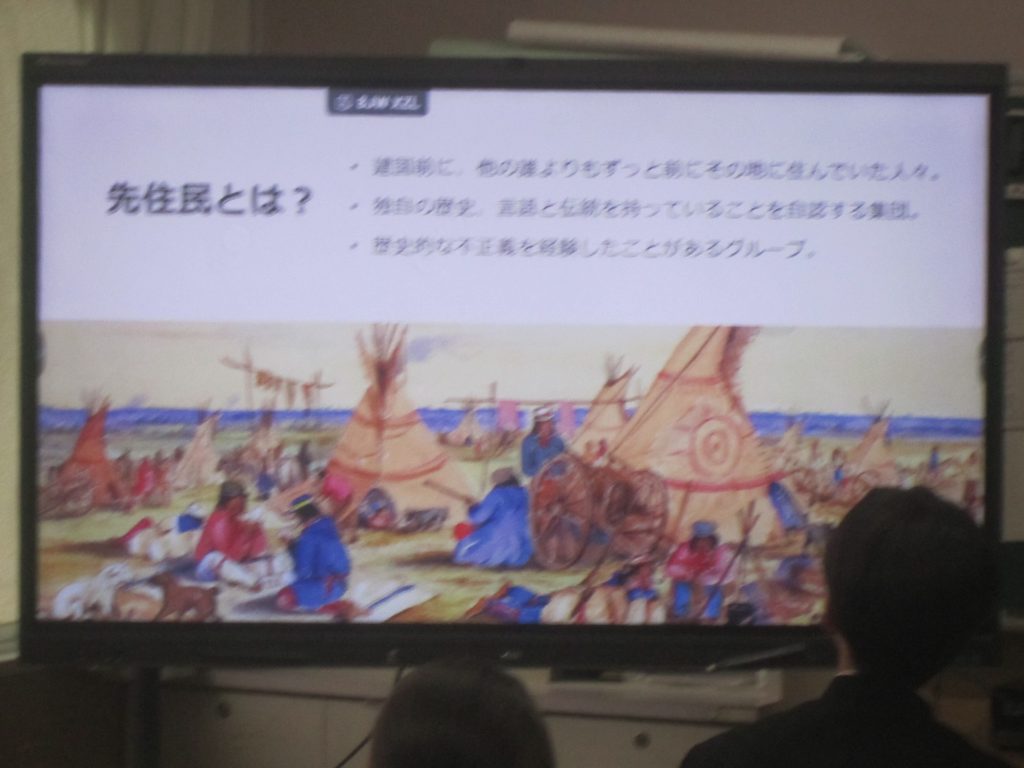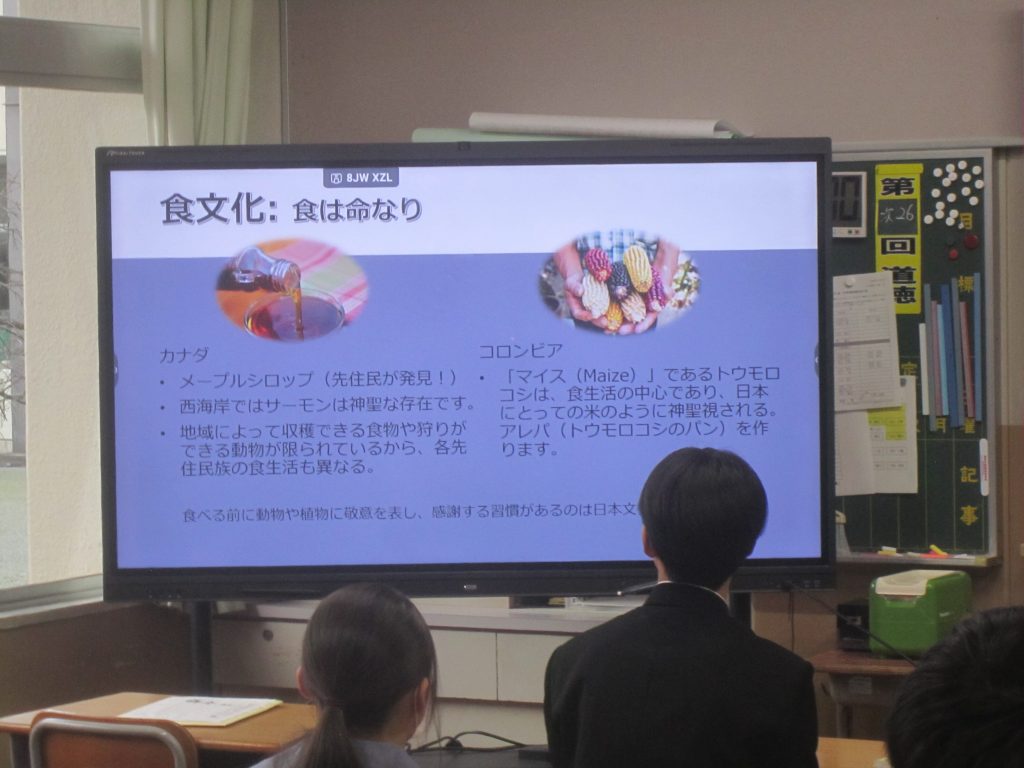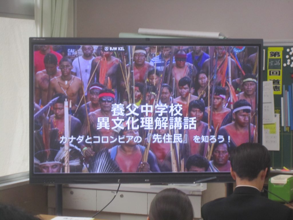 1月15日(木)、3年1組で、養父市国際交流員であるセサルさんに、3学期初めての異文化理解講話をしていただきました。コロンビアとカナダを“母国”とするセサルさん。今回は双方の先住民にスポットを当てた話を聞かせてくださいました。扱ったテーマは「食」「信仰」「自然」「楽器」・・・など多岐にわたりましたが、それぞれの文化はけっして過去のものではなく、現在も息づいているというお話がたいへん印象に残りました。今後順次各クラスをまわる異文化理解講話が続いていきます。