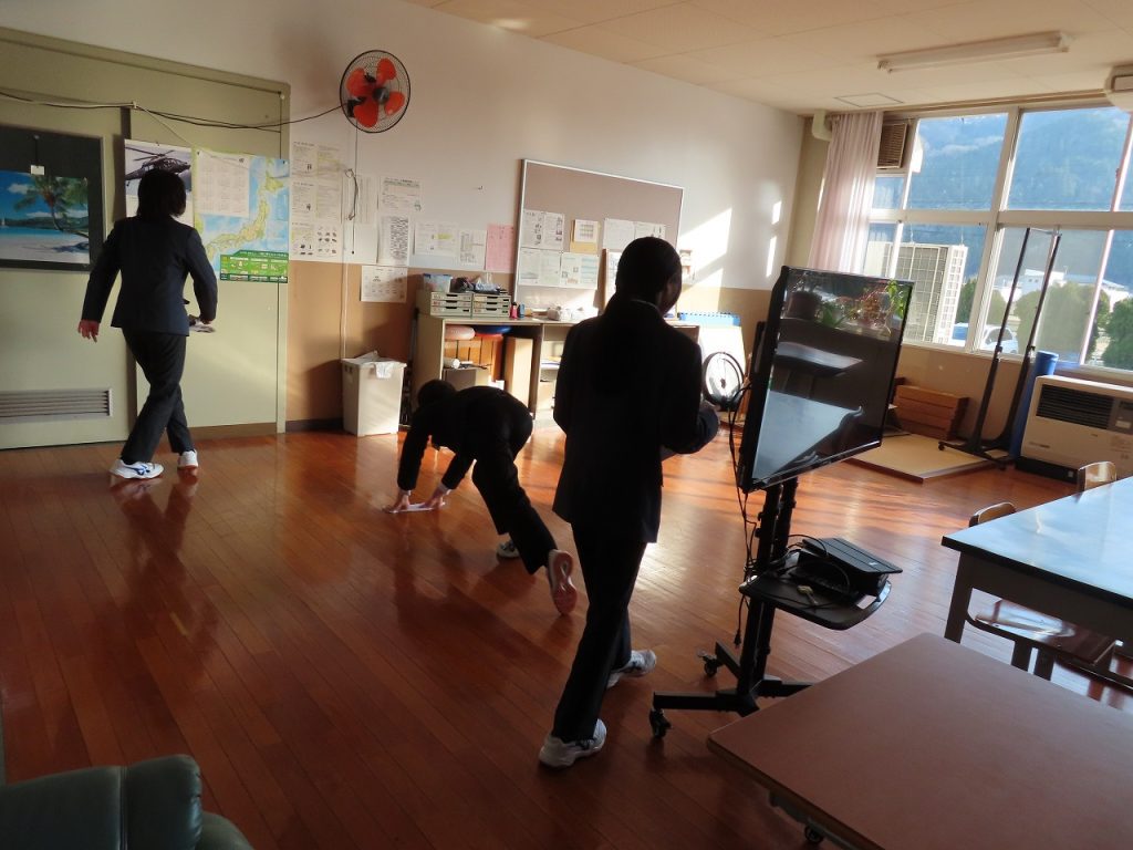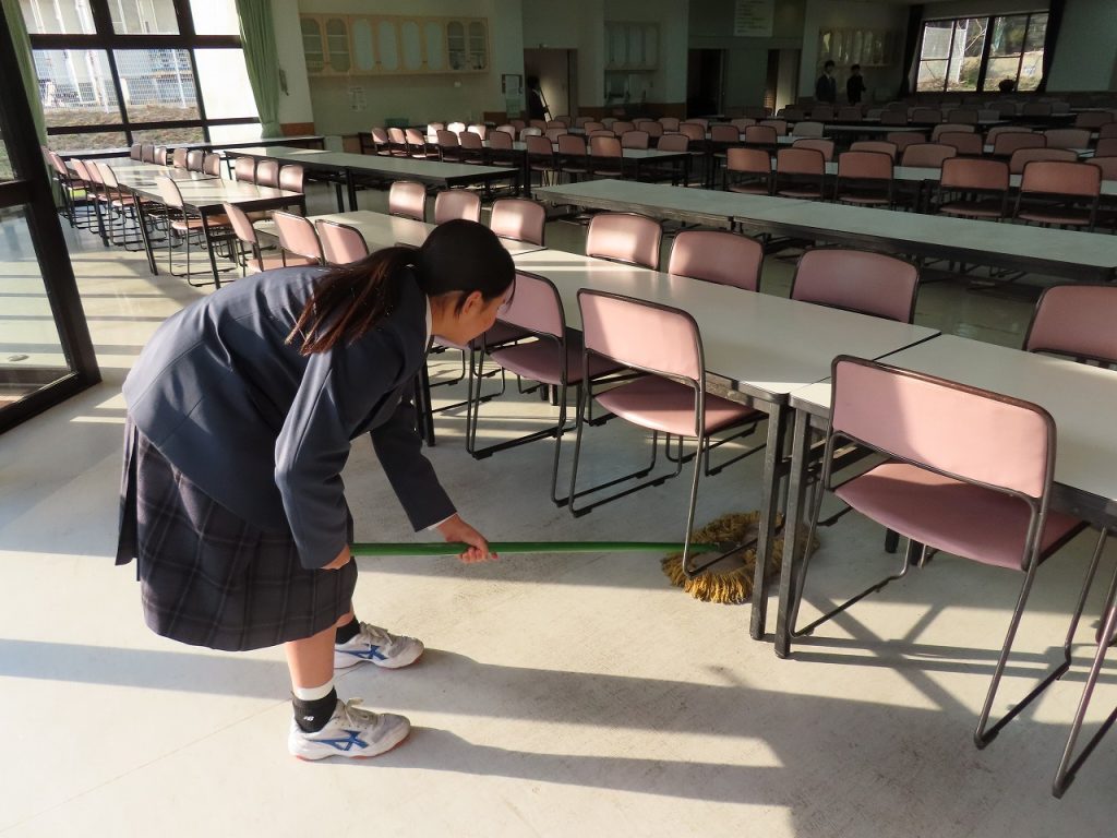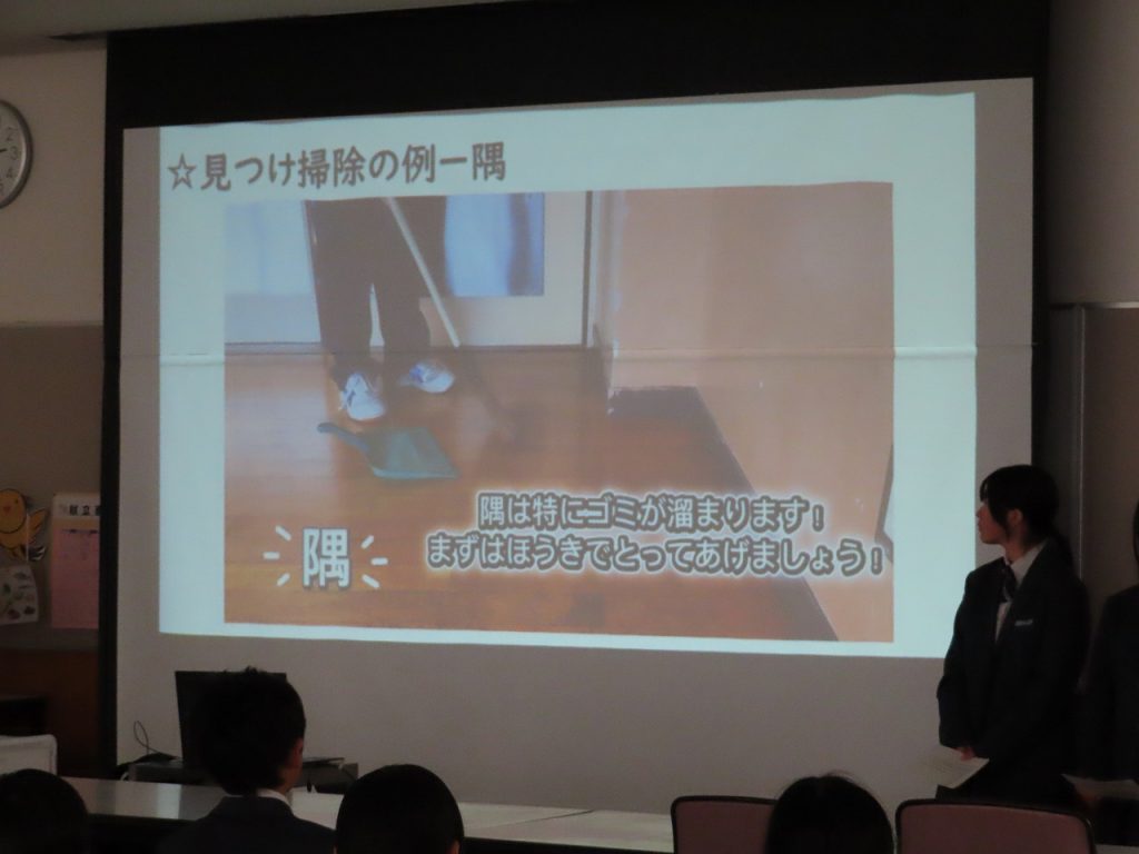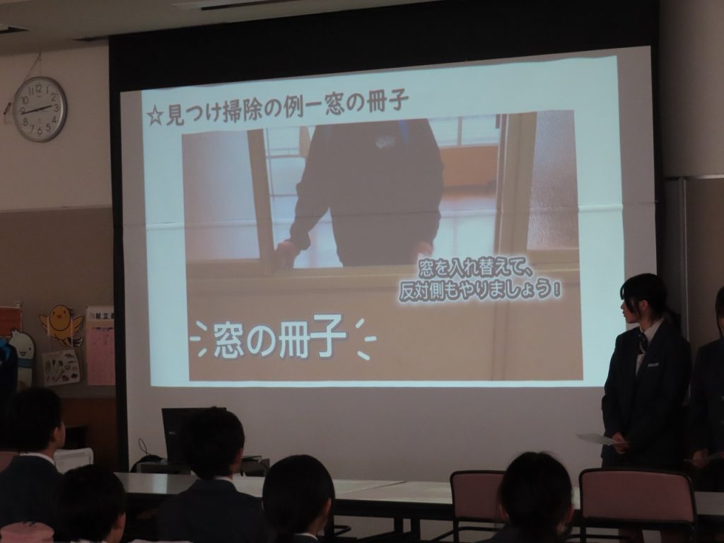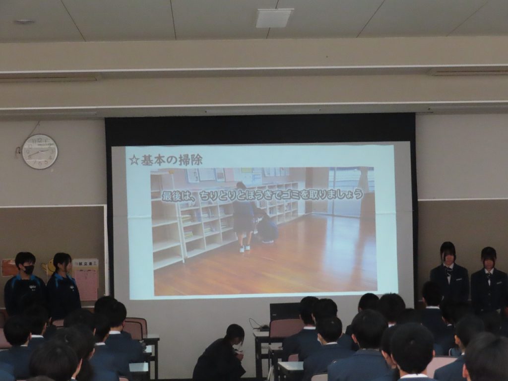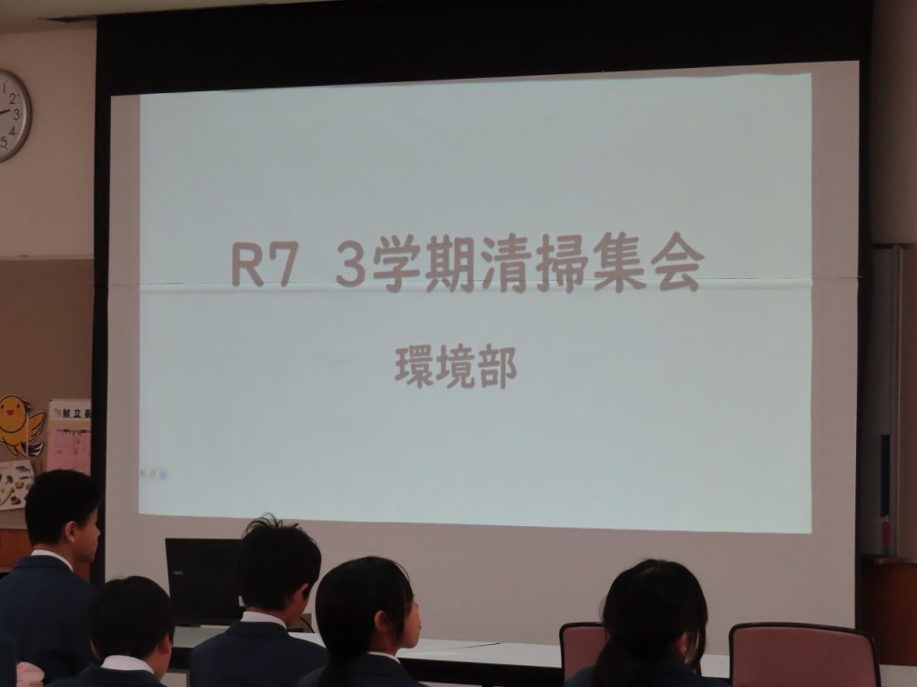 今日は3学期の清掃集会が行われました。今日の清掃集会では2年生の新環境部長が主体となって進行しました。 全校生は環境部が準備したスライドショーを見ながら、清掃の仕方や留意点についての説明を聞きました。その後、新しい掃除場所に分かれて、清掃リーダーを決定し、清掃用具の保管場所を確認し、清掃計画表を作成しました。そして、新しい清掃場所でリーダーを中心に一生懸命清掃に取り組む姿が見られました。これからも三心清掃を心がける養父中生としての自覚を持ち、清掃に頑張ってくれることを期待しています。