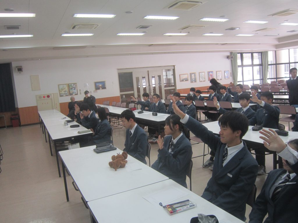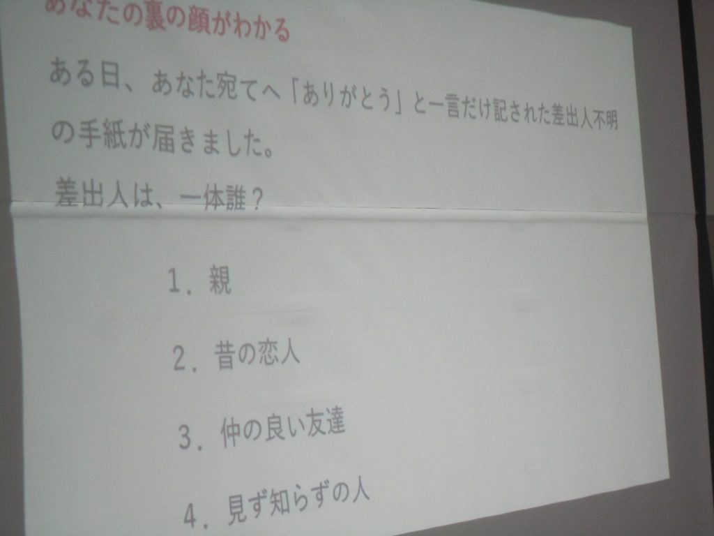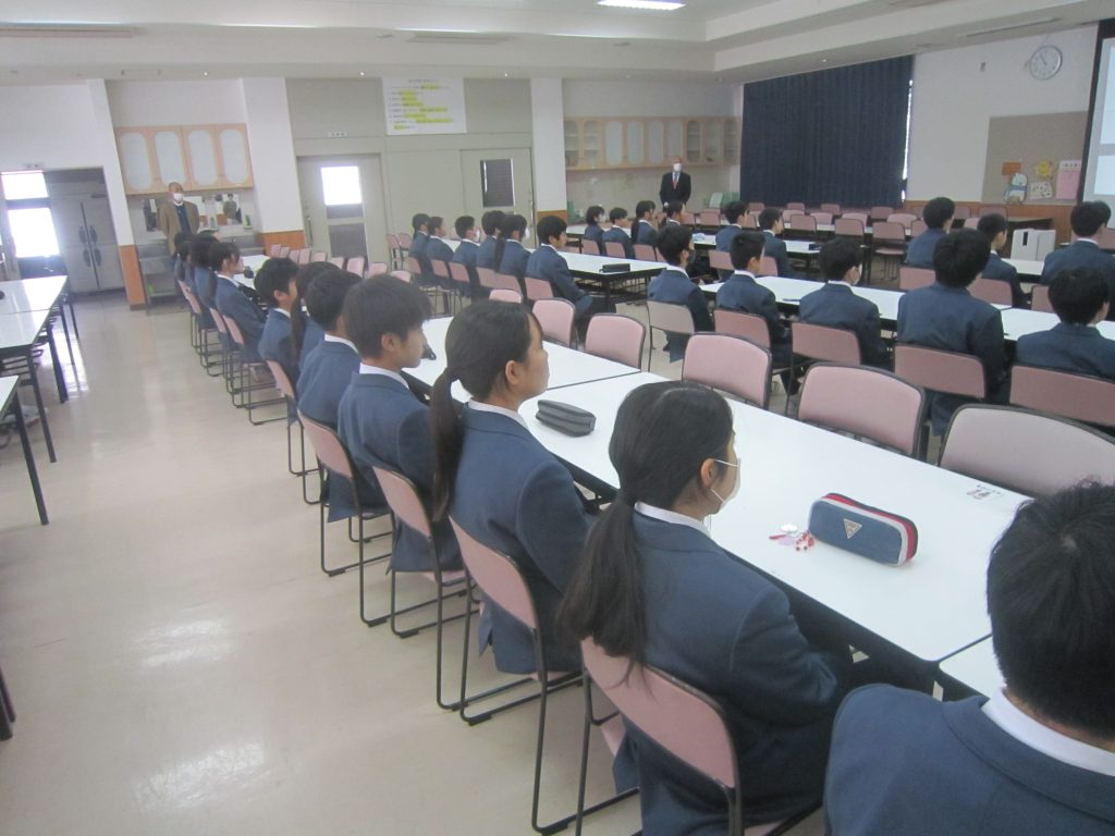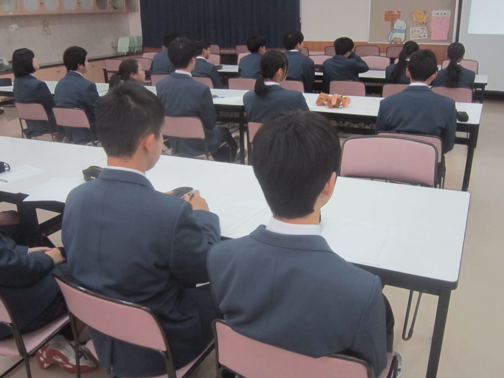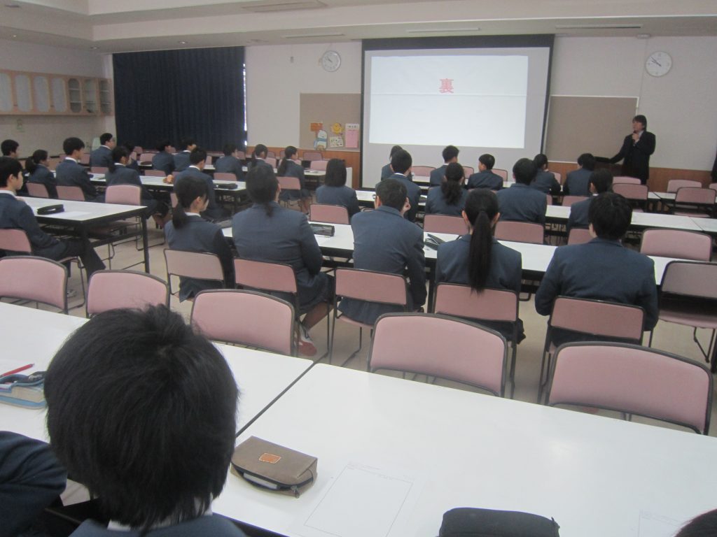 1月29日(木)1・2年生を対象にスクールカウンセラーによる授業を行いました。2時間目に行われた2年生の授業をのぞくと、「ある日、あなた宛てへ“ありがとう”と一言だけ記された差出人不明の手紙が届きました。差出人は、一体誰?」という生徒への質問が出されている場面でした。「親」と答えた人は、「責任感が強いタイプ」で、「昔の恋人」と答えた人は、「優しい心の持ち主」で、「仲の良い友達」と答えた人は、「情熱を持って取り組むタイプ」で、「見ず知らずの人」と答えた人は、「効率を重視するタイプ」だそうで、生徒は和やかなムードでその話を聞いていました。いっぽう、3時間目に行われた1年生の授業をのぞくと、「人間の体では腰が重要であり、腰を傷めないようにしなくてはいけません。日常の姿勢が悪いと腰を悪くするし、勉強など努力をしてもなかなか成果が上がらないなら姿勢を良くすることに気をつけてみるのが良いです。」という話がなされている場面であり、生徒たちは神妙な面持ちで耳を傾けていました。
