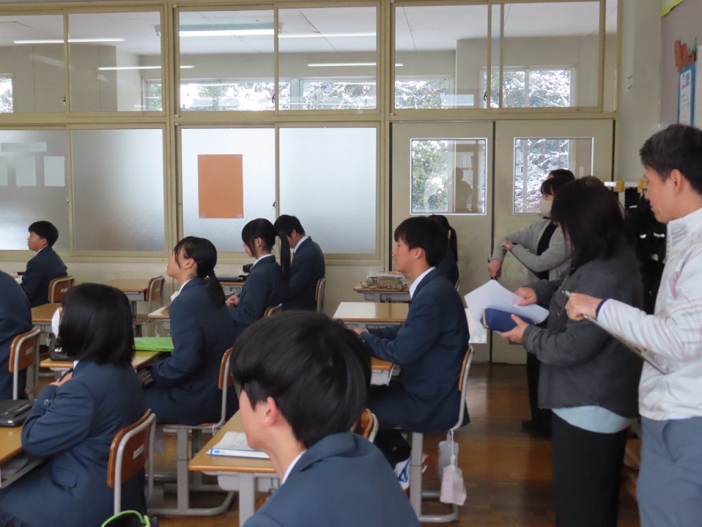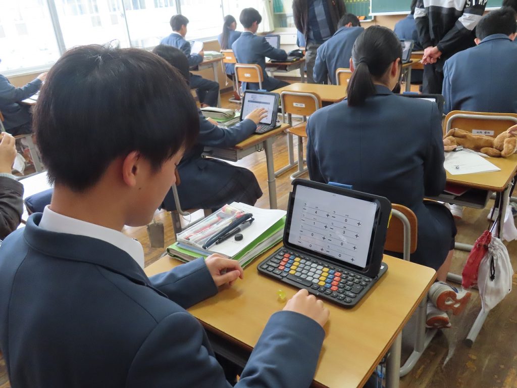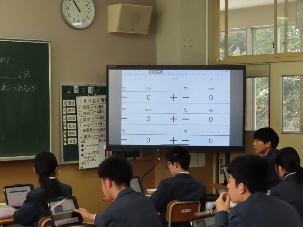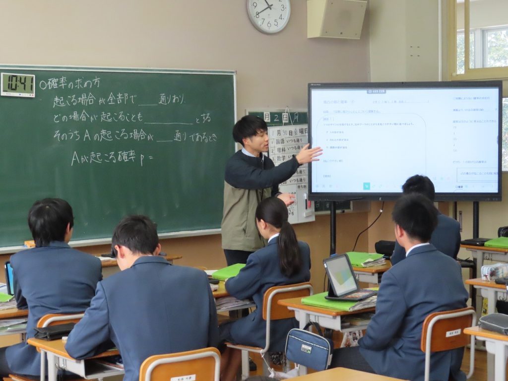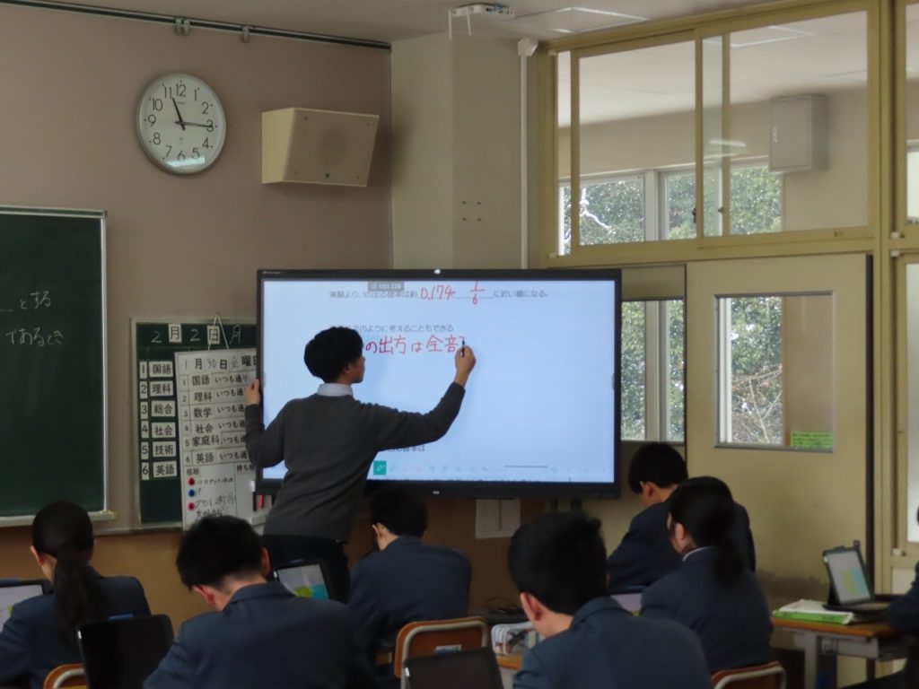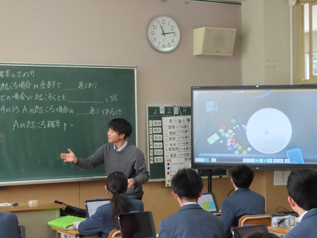 1月30日(金)の「1人1授業」は2年1組で数学の授業でした。単元名は「場合の数と確率」で、本時の目標は「同様に確からしい」について理解することでした。授業では生徒たちがサイコロを振りながら、タブレットを活用し、確率を考える内容でした。教師もモニターと黒板を上手に活用しながら、わかりやすい説明をしていました。授業を通して、生徒たち同士で意見や考えを交流する場面もたくさん見られ、協働的な学びをテーマとして授業が工夫されていました。1時間の授業があっという間に終わり、振り返りシートの中で、生徒たちは楽しく目標を達成することができたという感想が多くあり、充実した授業になりました。