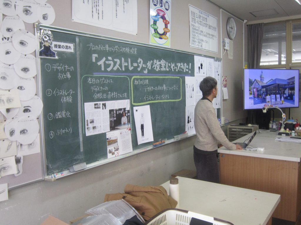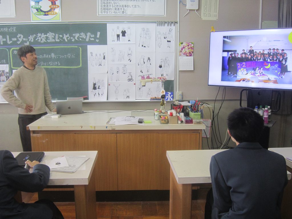 2月6日(金)、「YABUスクールチャレンジ事業(養父市教育委員会)」の一環として「イラストレーターが教室にやってきた!」を2年生を対象にして行いました。これは、美術の授業にイラストレーターの余根田直樹氏を外部講師としてお招きしてご指導をいただくというもので、今日は、生徒自身が自分を動物に見立てた「動物人間」のイラストを描きました。生徒たちは、余根田氏の丁寧なアドバイスを聞きながら、たいへん可愛らしいイラストを完成させていきました。なお、余根田氏は、養父中学校ホームページのトップにイラストをご提供いただいていますし、養父中学校のエンブレムの最終デザイン者でもあります。また、学校長が教師になって初めて学級担任をした時(旧八鹿中学校)のメンバーの一人でもあり、余根田氏は昔の懐かしいクラス写真(平成6年度八鹿中学校2年2組)を養父中学校の生徒へ披露してくれました。