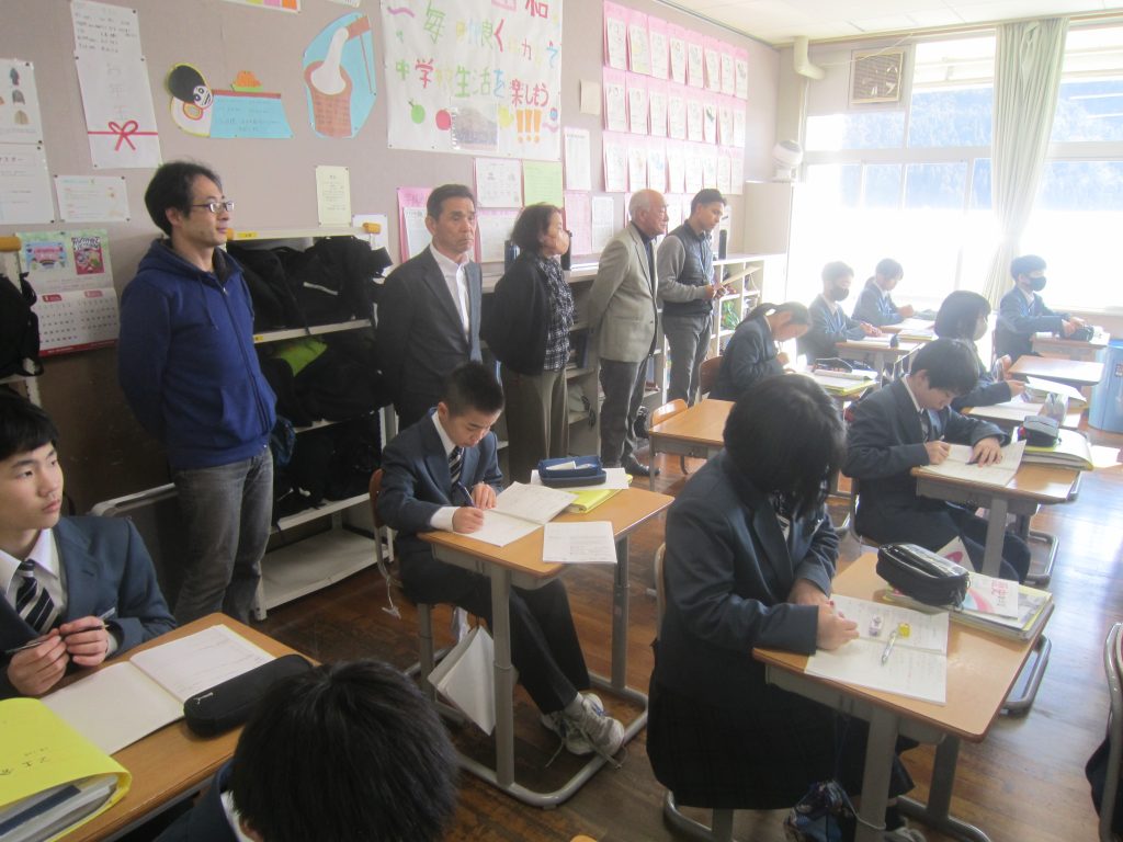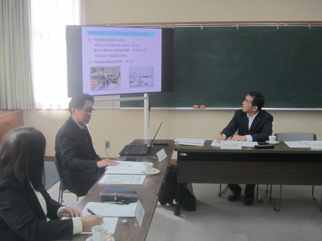 2月17日(火)、第3回学校運営協議会を開催しました。今回の主たる目的は今年度の養父中学校の運営に対する委員の皆様の「評価」を頂くことです。そのためにも、まずは授業参観をしていただき、教師たちの指導や支援に加えて、生徒たちの学びの様子をご覧いただきました。その後は、会議室にて今年度の学校の取組について、プレゼンテーションソフトを用いながら学校長より説明をしました。そして、あらかじめ配布しておいた養父中学校教職員による自己評価に加えて、保護者アンケートの結果、生徒アンケートの結果、さらには、これまで発行した学校だより「須留が峰」などをもとに委員の皆様からのご意見を伺いました。委員の皆様からは、「生徒たちが落ち着いて学習に取り組んでいる。」「生徒たちが楽しそうに授業を受けている。」「教師から新しいことに挑戦しようという前向きな姿勢を感じる。」「教師が一丸となっている。」「学校はいろいろなことを学べる場所であることが分かった。」などの意見とともに、不登校対応についてのご意見、生徒の保護者送迎についてのご意見、夏の暑さ対策に関するご意見なども頂戴し、養父中学校を多角的に見つめ直す良き時間となりました。特に、「(今回の学校運営協議会に参加してみて)日頃から、学校がこれだけたくさんの地域の方から学ばせていただいているということがよく分かった。」というお声が印象に残りました。また、来年度に向けて、これまで以上に学校運営協議会を核としたコミュニティスクール化を前進させていくという方向性、そのために、山口県まで視察研修に出向いたことなどを学校長より説明しました。委員の皆様、そして地域の皆様、これからも養父中学校をよろしくお願いします。なお、今年度の「学校評価(自己評価、学校関係者評価)」は3月末に学校ホームページに掲載する予定です。