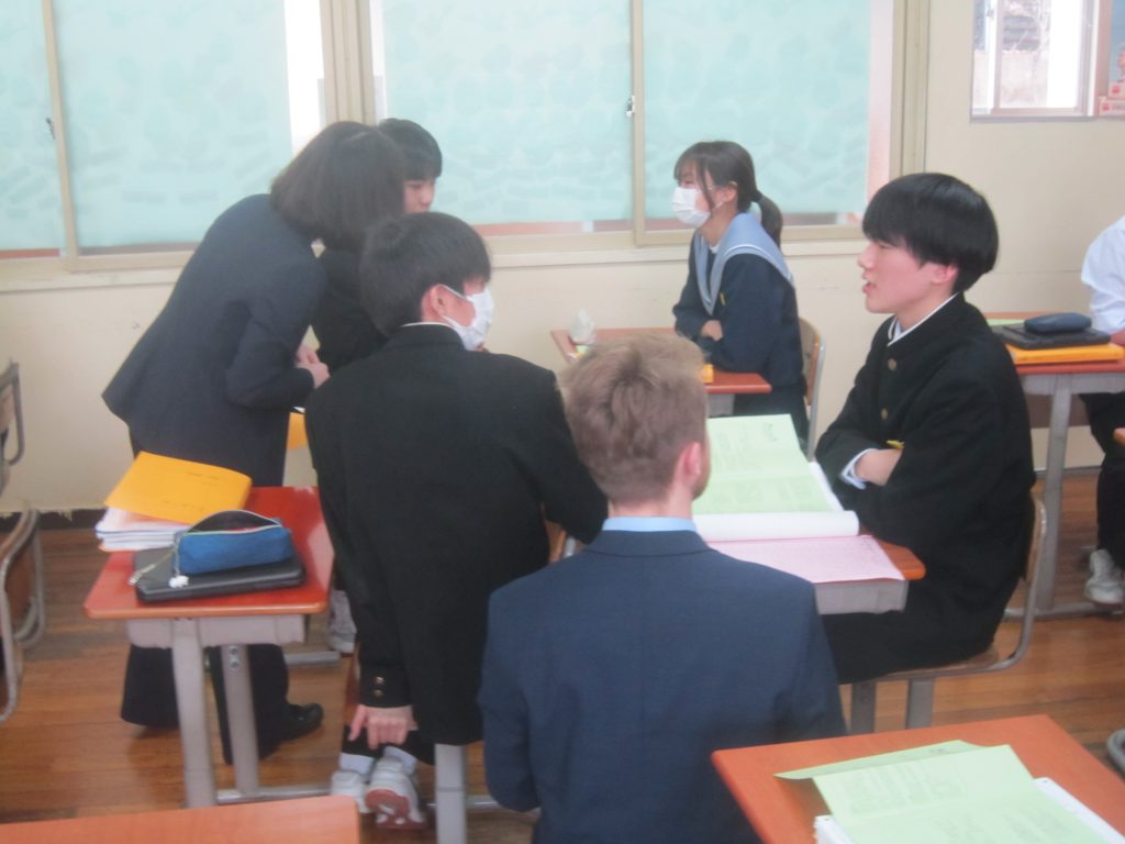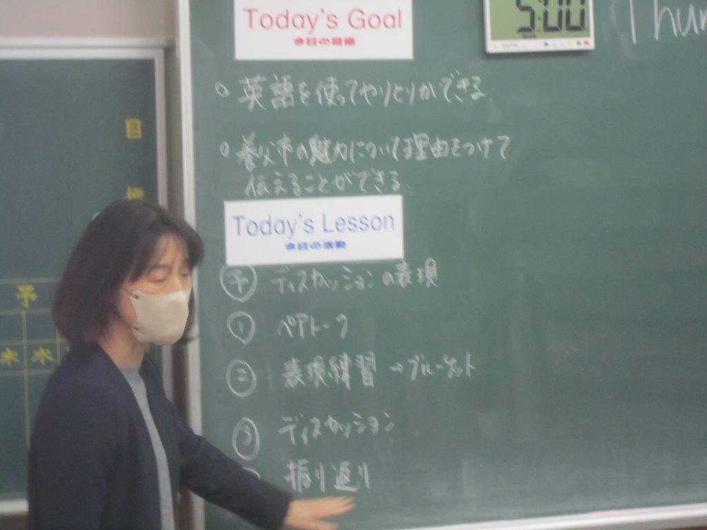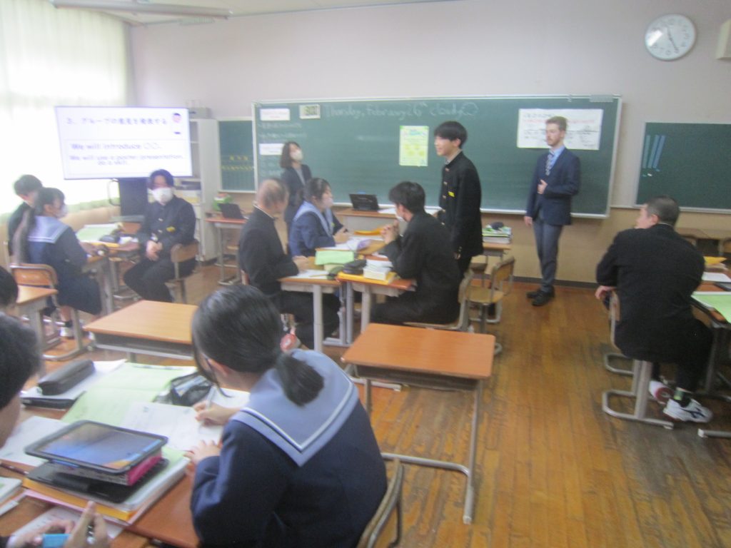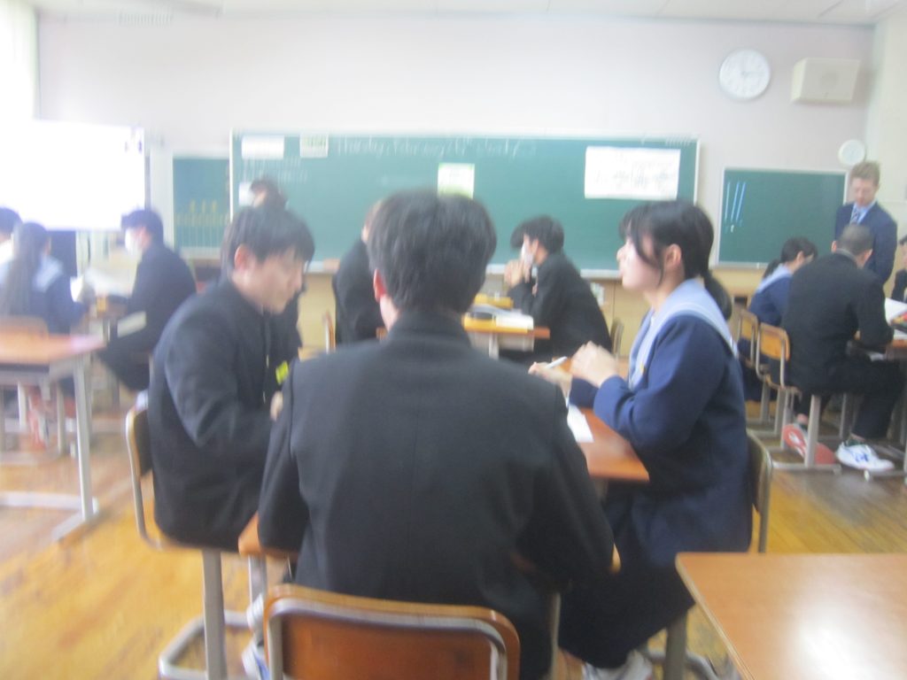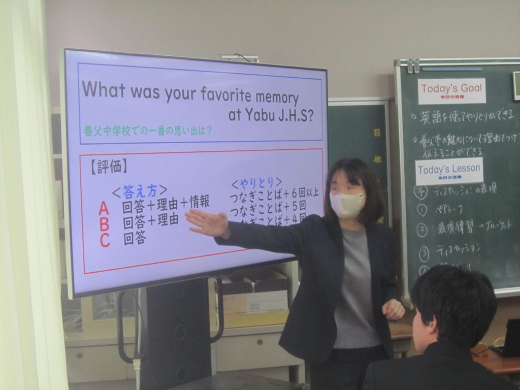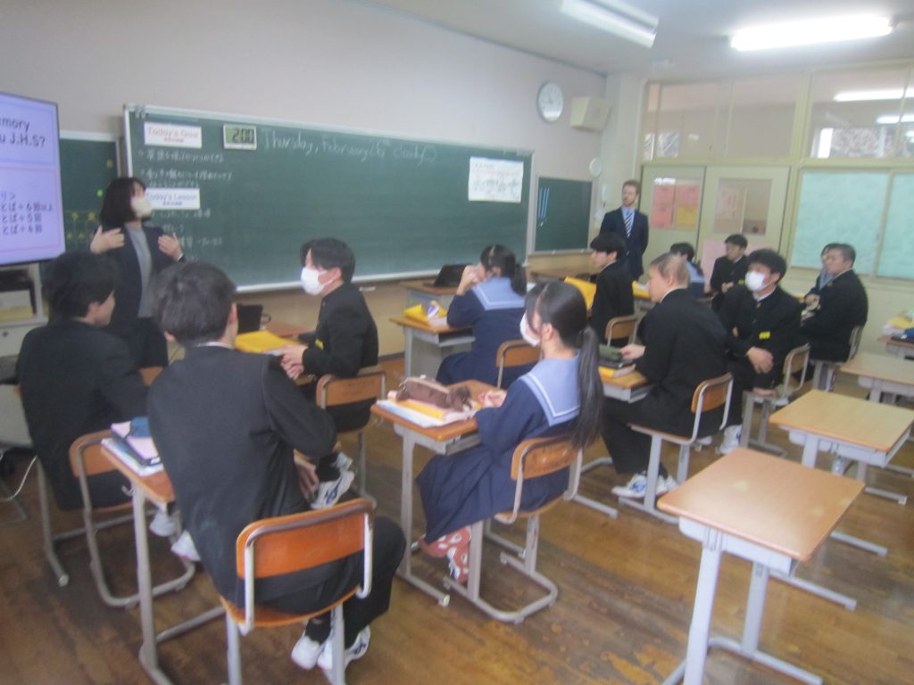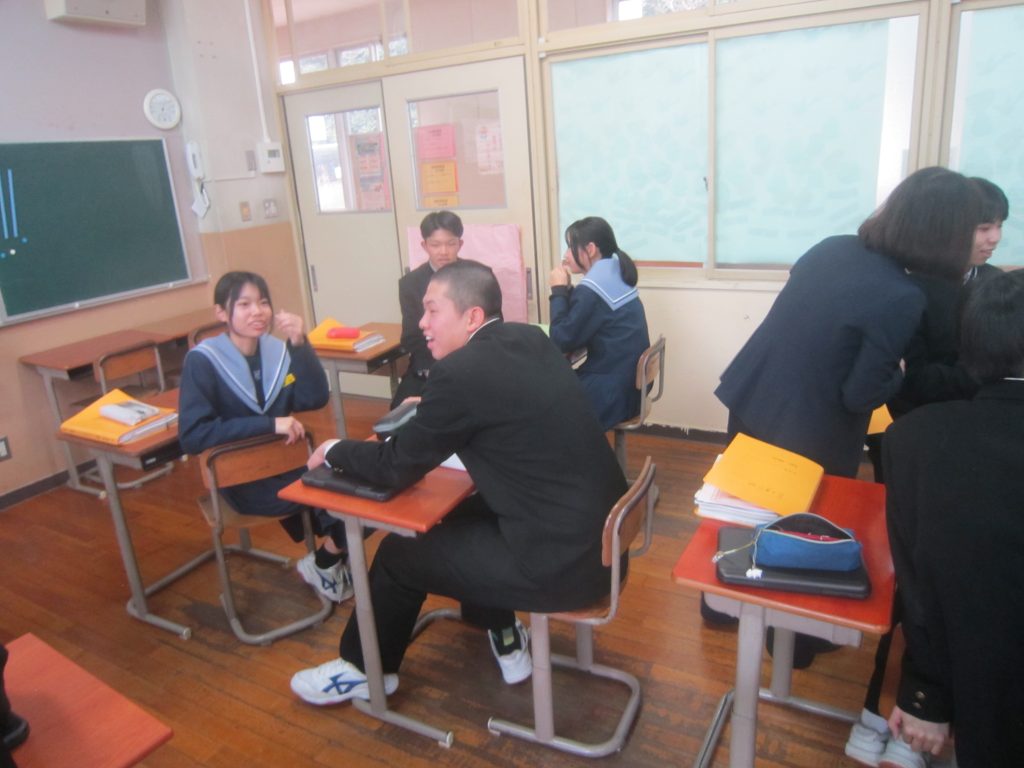 2月26日(木)の「1人1授業」は3年2組で英語の授業でした。単元名は「養父フェスに参加しよう~養父市の魅力を世界に~」で、本時の目標は「英語を使ってやりとりができる」「養父市の魅力について理由をつけて伝えることができる」と設定されていました。生徒たちは、その目標に向かって、英語を使った会話(養父市の魅力:自然、文化財、食べ物・・・)を教室のあちらこちらで活発に展開しており、まるで外国にいるかのような錯覚に陥ってしまいました(笑)。授業の冒頭で、この時間の授業の流れが担当教員から示されたのと同時に、どこまで到達すれば良いのかの評価基準も明確に示され、そのことによって生徒たちの学習に迷いが生じなかったことがその活発な会話につながったものと思われます。とは言ってもいくら教師が一生懸命準備しても、生徒がなかなか動いてくれないこともあります。今日の生徒の頑張りを高く評価したいと思いました。