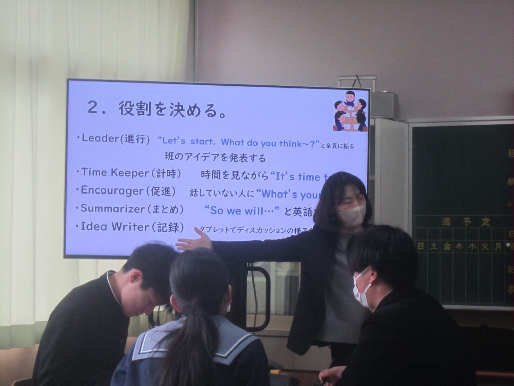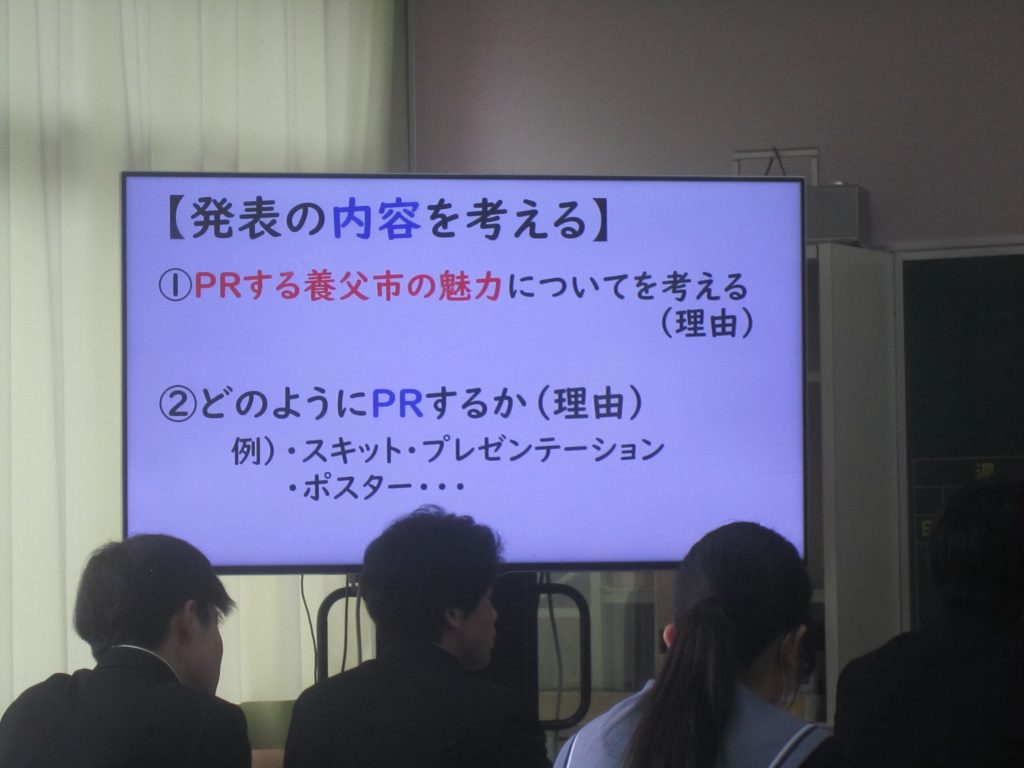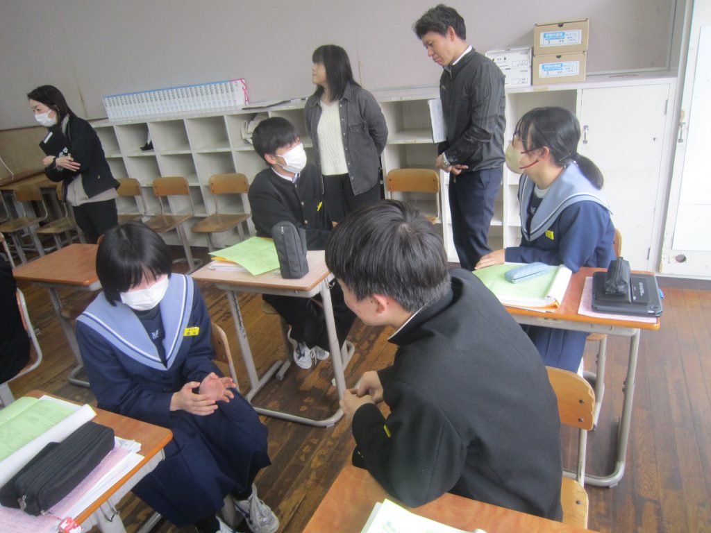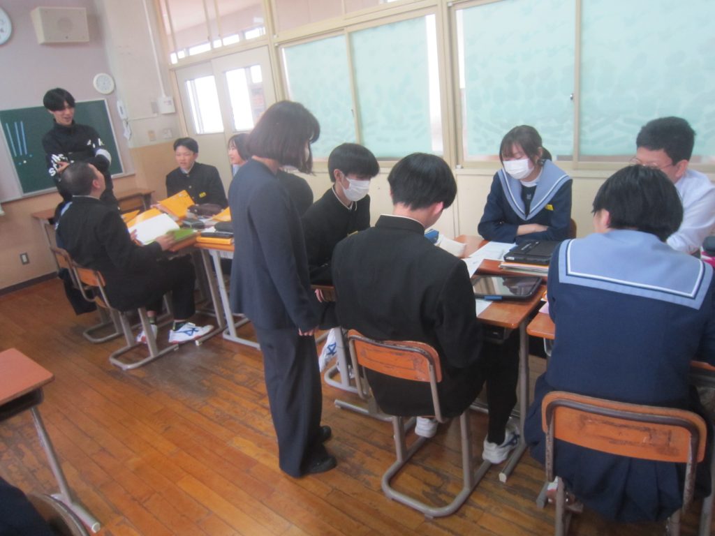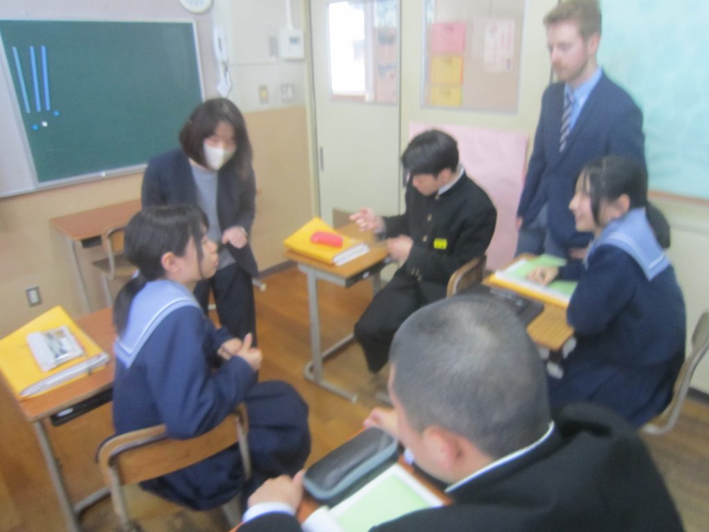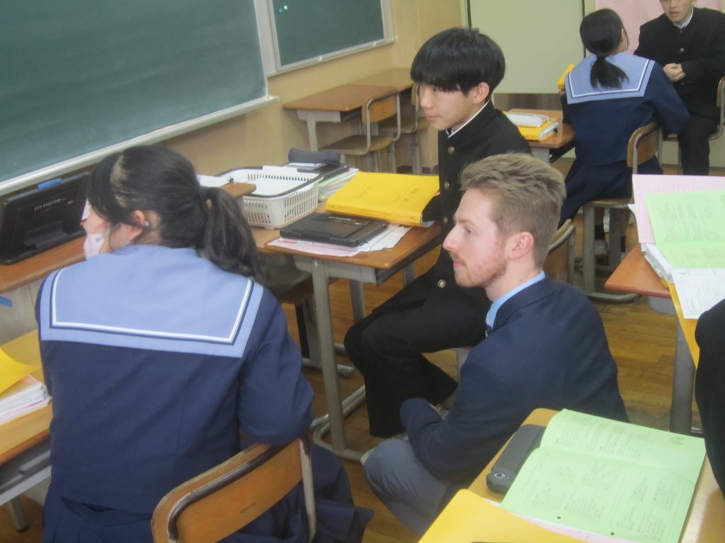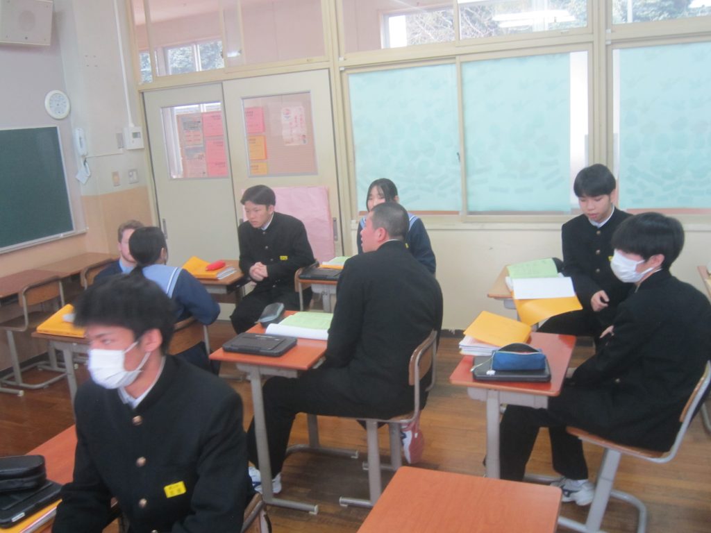 2月26日(木)の「1人1授業」は3年2組で英語の授業でした。単元名は「養父フェスに参加しよう~養父市の魅力を世界に~」で、本時の目標は「英語を使ってやりとりができる」「養父市の魅力について理由をつけて伝えることができる」と設定されていました。生徒たちは、その目標に向かって、英語を使った会話(養父市の魅力:自然、文化財、食べ物・・・)を教室のあちらこちらで活発に展開しており、まるで外国にいるかのような錯覚に陥ってしまいました(笑)。授業の冒頭で、この時間の授業の流れが担当教員から示されたのと同時に、どこまで到達すれば良いのかの評価基準も明確に示され、そのことによって生徒たちの学習に迷いが生じなかったことがその活発な会話につながったものと思われます。とは言ってもいくら教師が一生懸命準備しても、生徒がなかなか動いてくれないこともあります。今日の生徒の頑張りを高く評価したいと思いました。