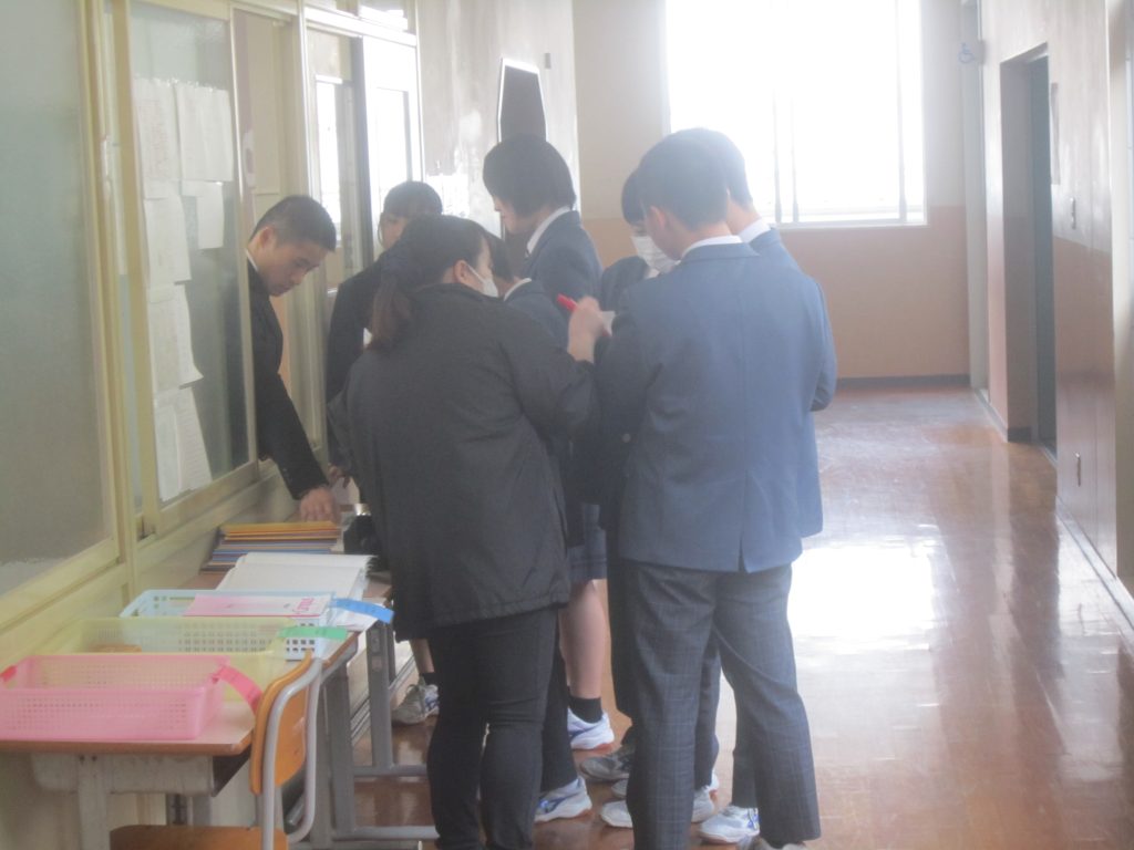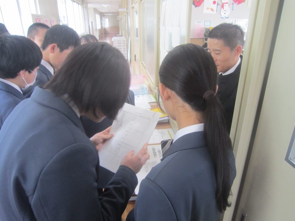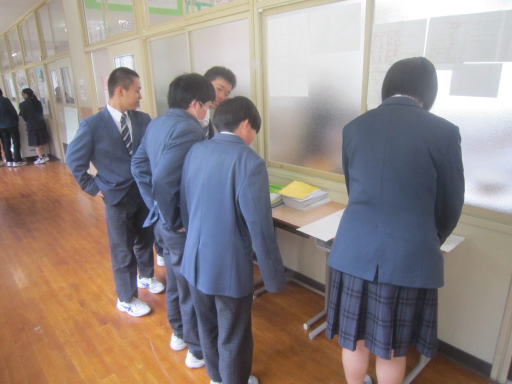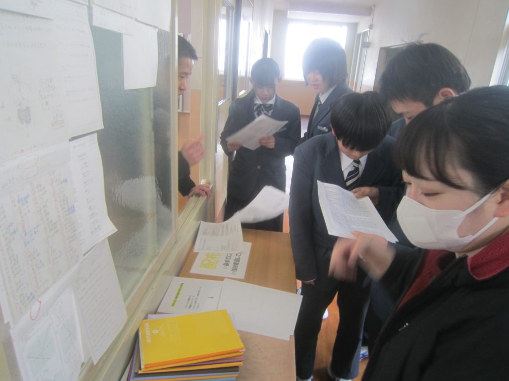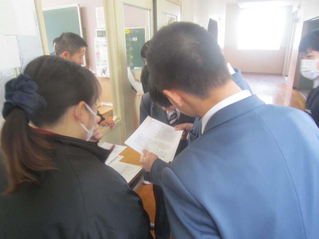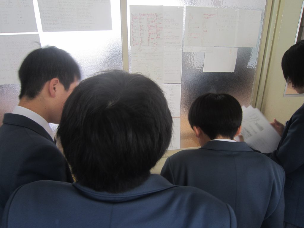 校舎内を歩いていると、3月12日(木)に行われた公立高校学力検査の問題が提示されていました。それをよく見てみると、1年生や2年生でも正答することのできる問題も少なくなく、3年間の継続した学習習慣が大切であることがよく分かりました。また、どの教科も問題の文字数がたいへん多く、まずは読む力がないことには解けないこともよく分かりました。休み時間には多くの生徒が問題を手に取って内容を確認していましたし、生徒への助言をする教員の姿がありました。中には、試験当日夕方の某テレビ番組による学力検査解説を視聴したという生徒も居たようです。