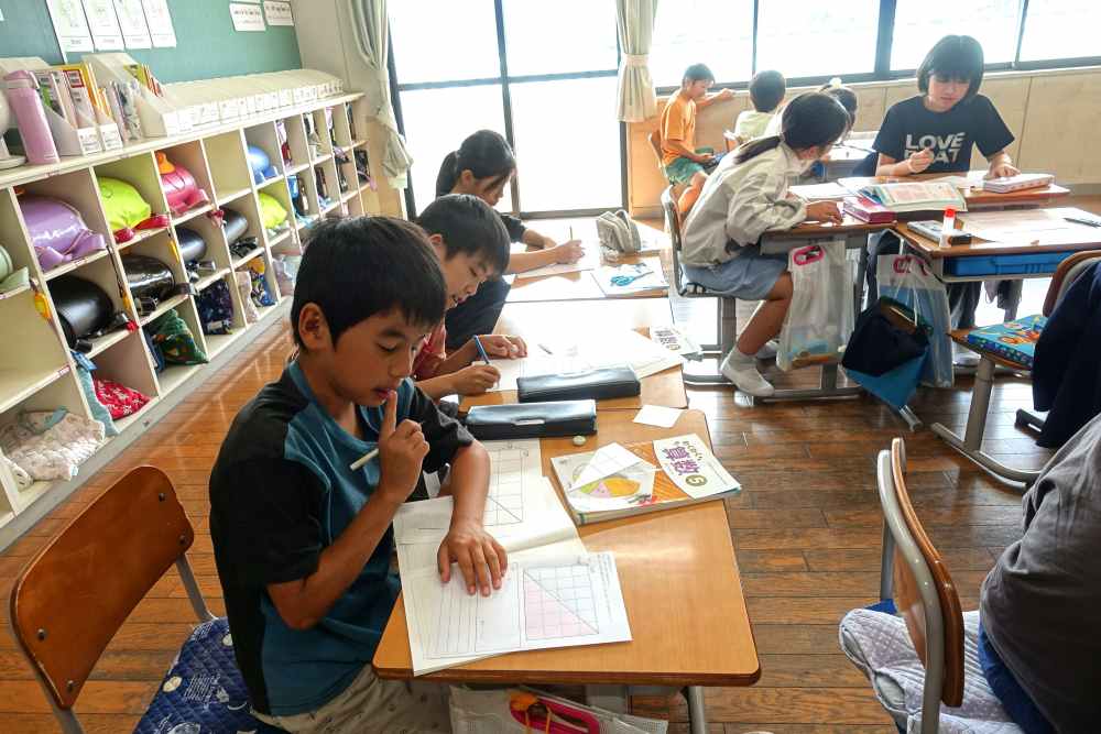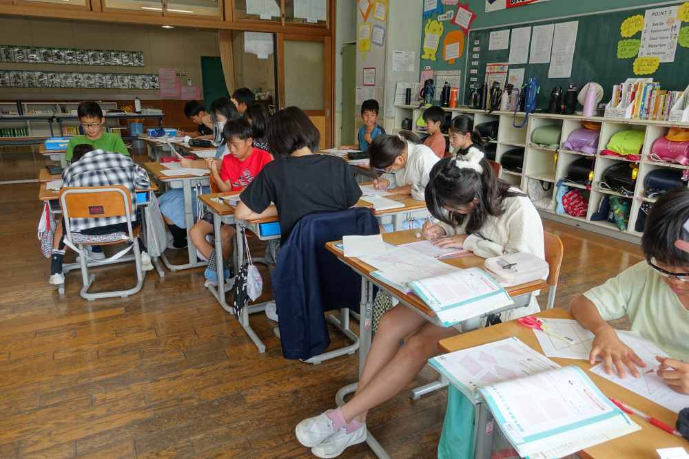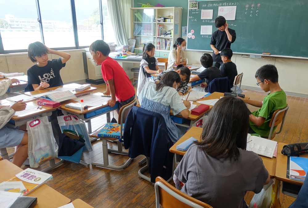 5年生の算数の授業風景です。直角三角形の面積を求める学習で、「はやく かんたん せいかく」な求積方法を考えました。既習事項をヒントに自分で考えた後、班で話し合い、プリント図に考え方を示してから式を作り、求め方を文章化するという流れでした。式を作った後に、なぜその式になったのか、相手にわかりやすく伝えるのはとても大切なことです。説明できるのは、自分がわかっているからこそです。