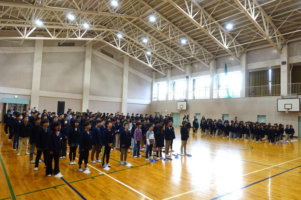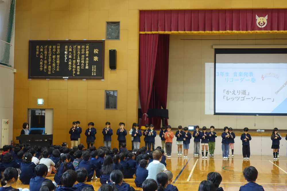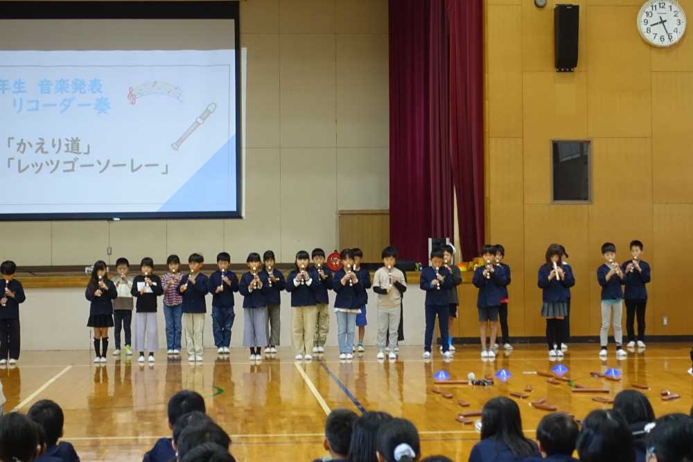 10月28日は、音楽朝会でした。最初に合唱した「島人ぬ宝」は途中で「イーヤーサーサー」の声を学年部ごとに入れたり、太鼓を鳴らしたりと、全校生ならではの迫力ある歌声でした。学年発表は3年生でした。1学期から学習してきたリコーダー演奏を2曲聴かせてもらいました。「ソラシドレ」の音を美しく響かせて、素敵なメロディーを奏でてもらいました。