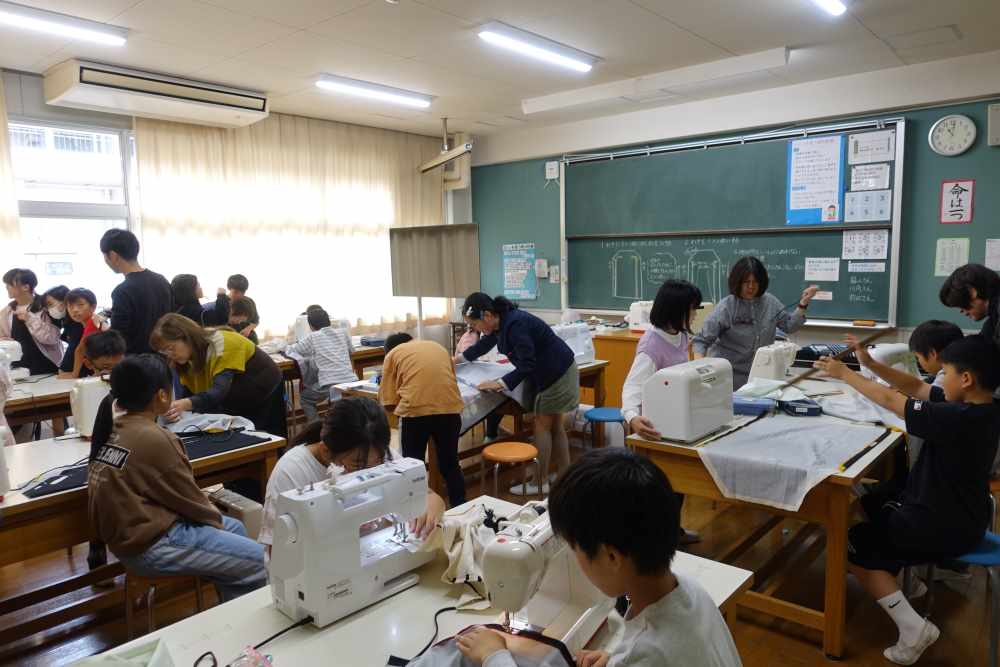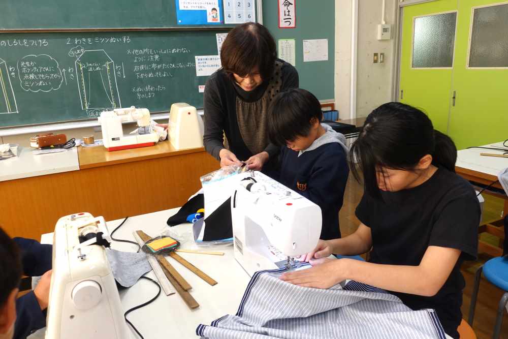 5年生家庭科では2学期の学習にエプロン作りがあります。初めてミシンを扱う子どもたちのお助けに、ソーイングボランティアの皆さまが来てくださっています。印の付け方や針の刺し方、返し縫いの仕方など、基本的な操作はもちろん、「あ!失敗してしまいました」という子どもたちの声に、すぐに対応してくださる応援団です。完成したら、給食準備をこのエプロンで行うことになります。