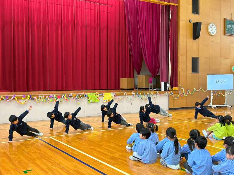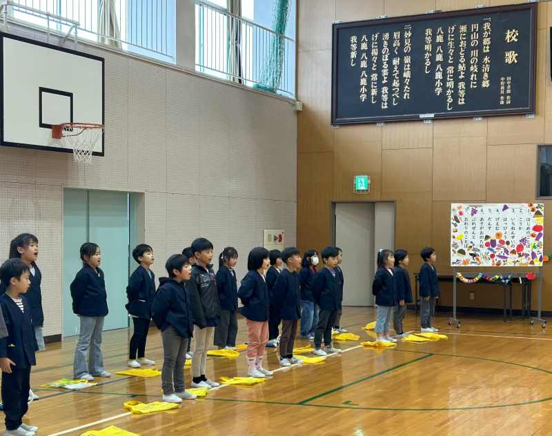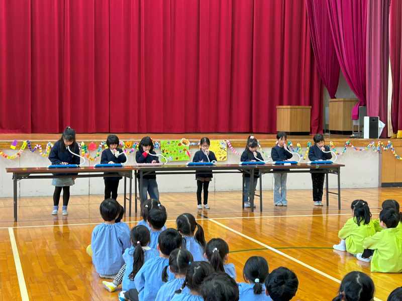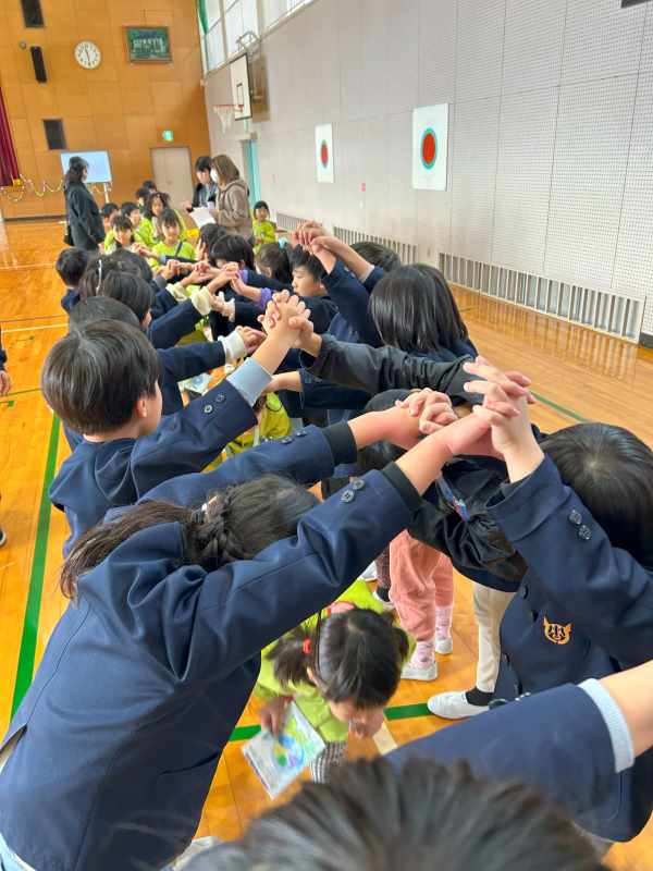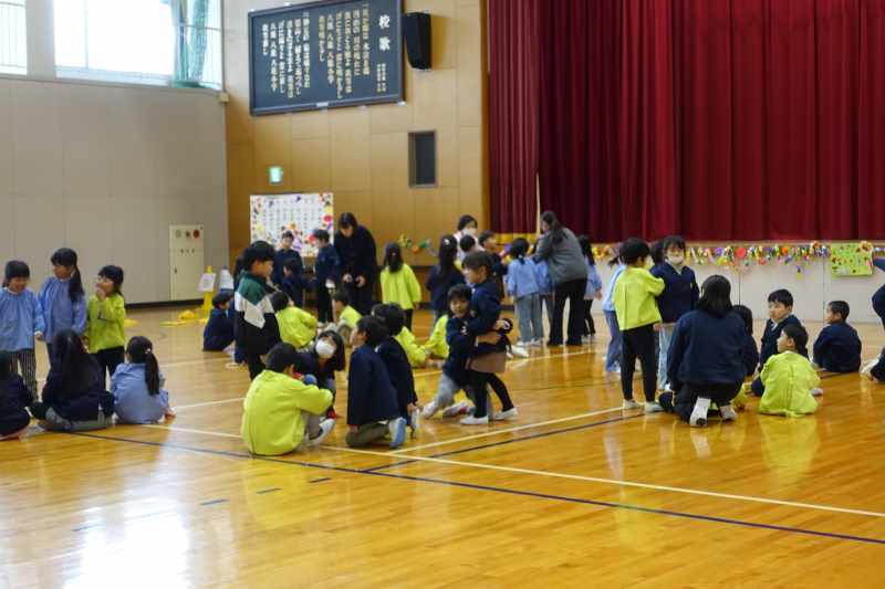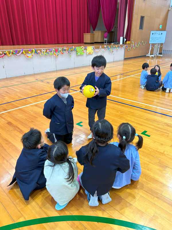 11月25日、こども園の園児のみなさんと1年生の交流会をしました。会場の飾り付けからみんなで協力し、司会進行もつとめました。それぞれのチームで学習したことを披露したり、輪になって自己紹介をした後はゲームを楽しんだりしました。園児のみなさんに優しく声をかけたり、誘ったりしている1年生が、とてもたのもしく見えました。アサガオのタネをプレゼントし、花道でお見送りをしました。