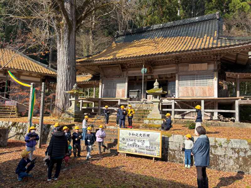 12月2日、2年生は小佐地区石原にある日光院を訪れました。日光慶重が開いたと伝えられるお寺です。秋も深まり、イチョウの葉が屋根や地面に散り敷いていました。樹齢600年を超える大イチョウだそうです。八鹿小学校の校区には、こんなに素晴らしい場所があります。ふるさと再発見の時間となりました。