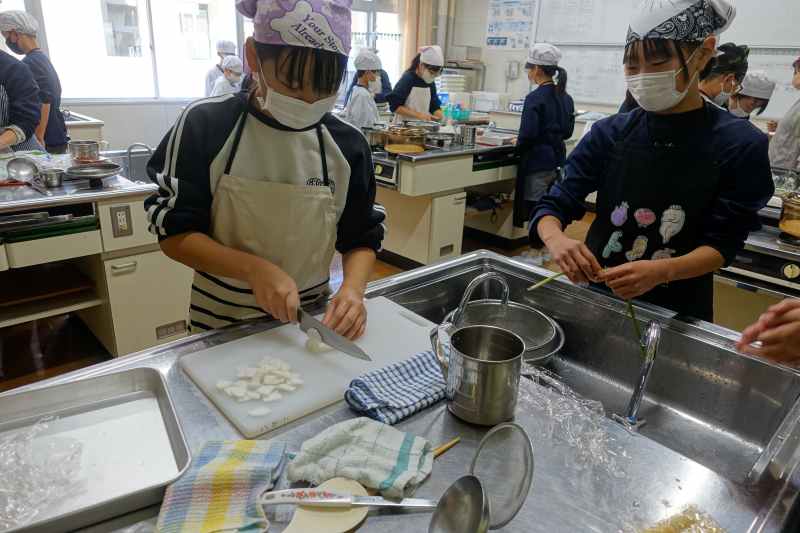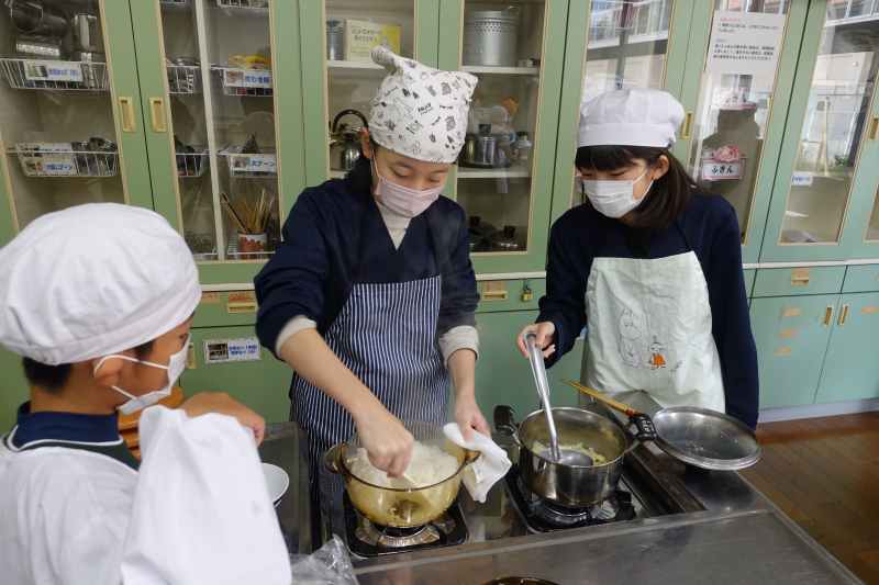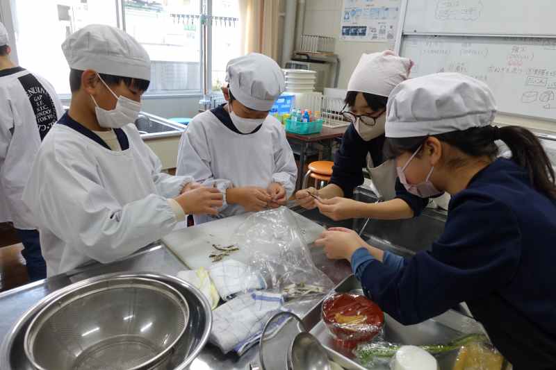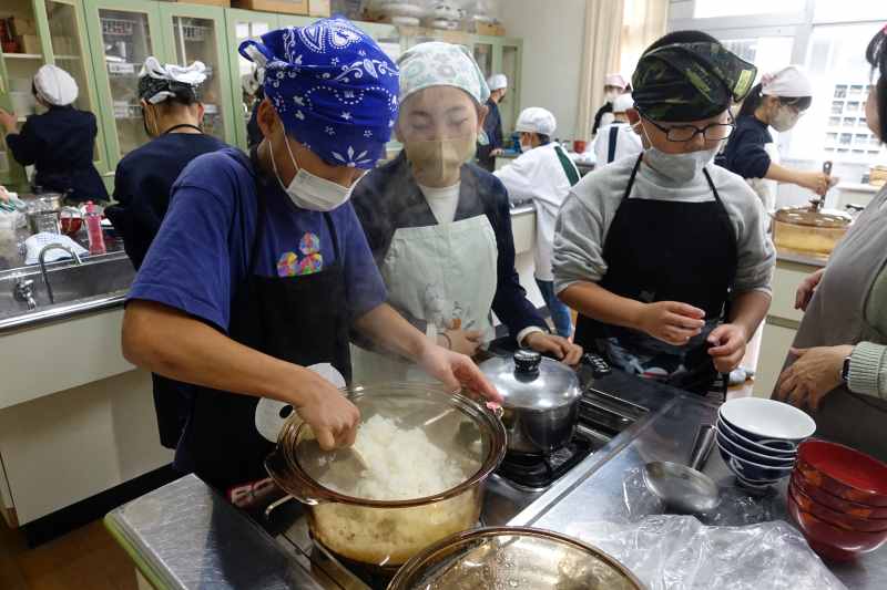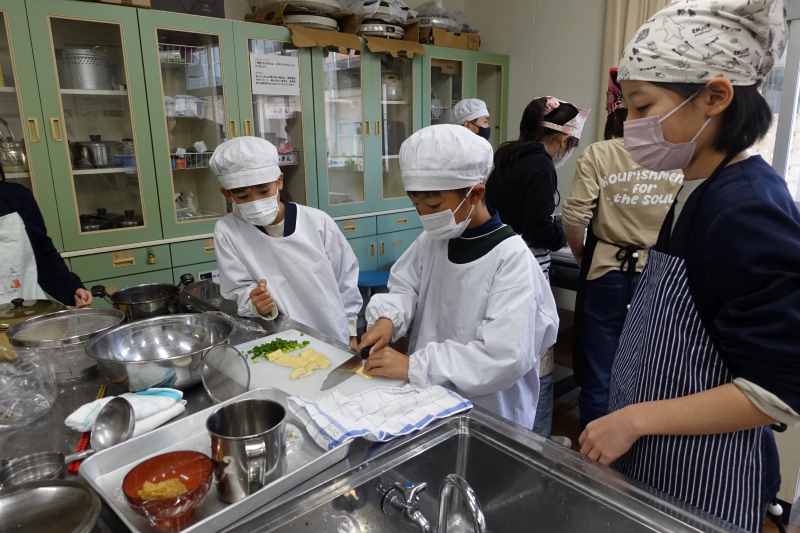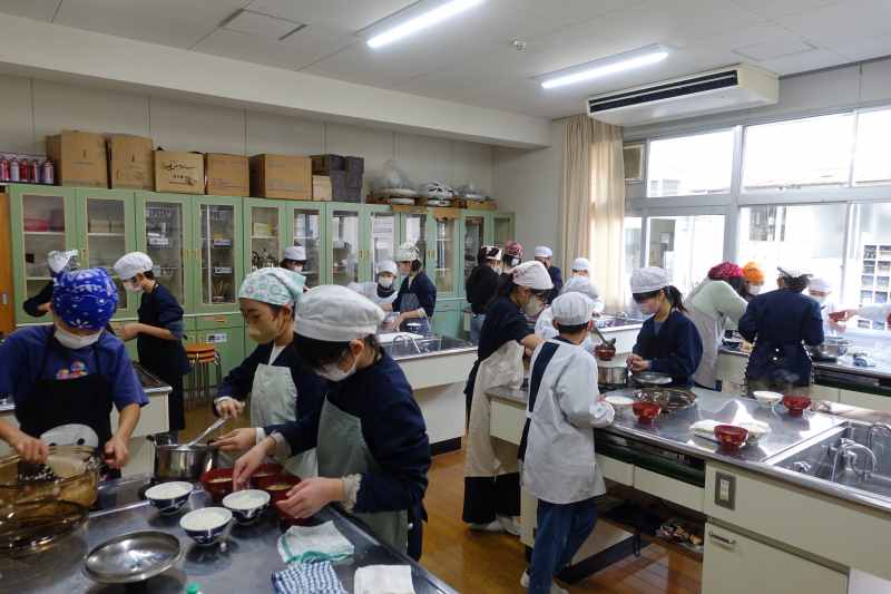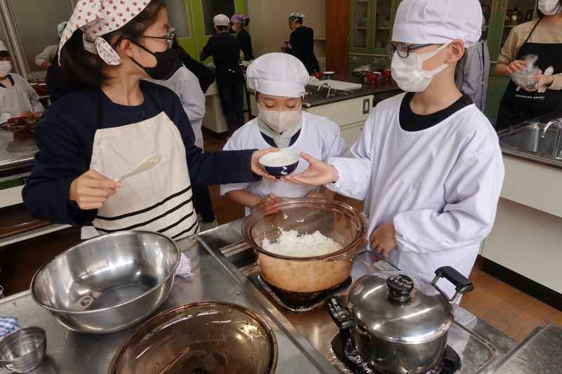 12月9日、5年生の家庭科は調理実習でした。鍋で炊くご飯と、にぼしでとっただし汁からの味噌汁を作りました。先生の話をしっかり聞いて、手順を確認してから班の仲間と協力して作業をしました。ご飯と味噌汁、どちらも火加減が大切です。作業しながら片付けをし、出来上がった頃には調理台の上がきれいに片付いていました。これで、食事のお手伝いができるようになります。