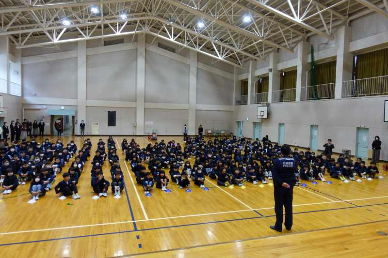 12月24日は、2学期の終業式でした。終業式後、南但馬警察署八鹿駅前交番よりお越しいただいた後藤巡査から、交通安全講話をしていただきました。道路ではふざけないこと、自転車のルールを守ること、そして不審者には「助けて!」と大きな声で周りに助けを求めることを約束しました。年末年始、八鹿の町の中は交通量がふだんよりも多くなります。交通安全に気をつけ、新学期には全校生の元気な顔がみられますように。