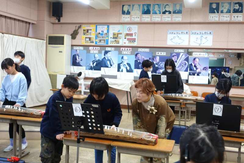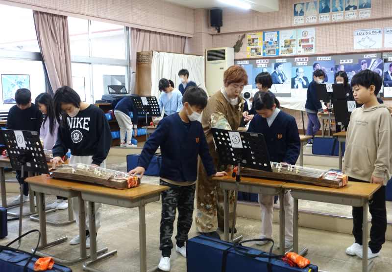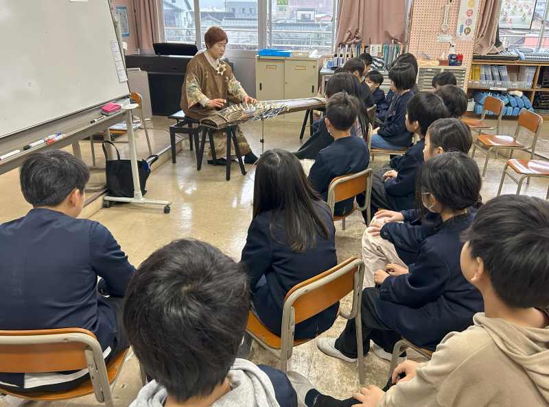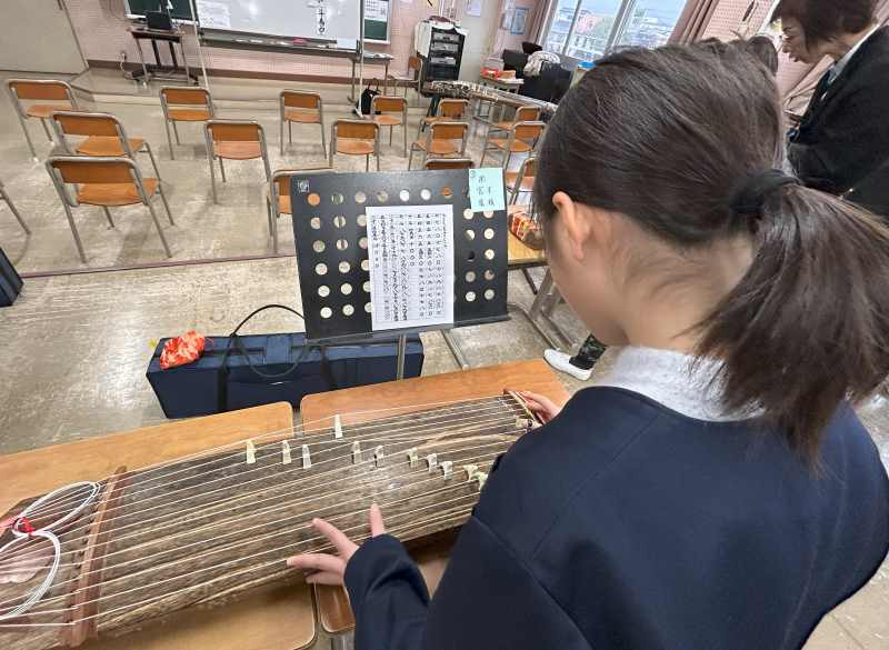 1月20日に、音楽の授業で、本校を卒業された地域の方を講師にお招きして本物にふれる体験学習をさせていただきました。最初に演奏を聴かせていただき、箏の流派や爪の種類、楽譜の読み方などを丁寧に教わりました。弦のひき方を学んでから、それぞれグループに分かれて実際に弾いてみました。見慣れない数字の楽譜に、最初はぎこちない弾き方でしたが、慣れてくるとあちこちで「さくらさくら」の音色が響きました。大変貴重な体験をさせていただきました。