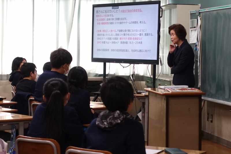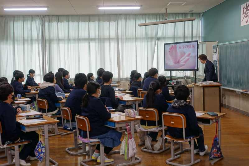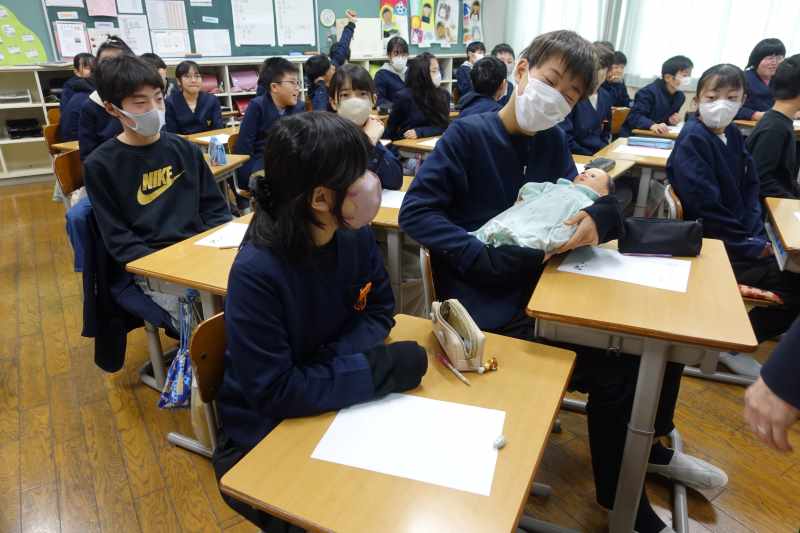 1月27日、八鹿病院の助産師さんを講師にお招きして、『命』についての学習をしました。生命誕生の神秘や、妊娠・出産について、今の自分を大切にすることを学びました。自分たちが今こうしてここにいることは奇跡なのだと感じ、家族に感謝の思いをもつ時間となりました。最後に生まれた赤ちゃんと同じくらいの赤ちゃん人形を、一人ずつが抱かせていただく体験をしました。約3㎏の重みですが、重さだけではない命の尊さを感じてくれたことと思います。