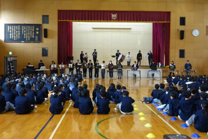 2月24日は、最後の音楽朝会でした。最終回は、先生バンドの登場です。朝の歌で歌っていた「沈丁花」という曲を演奏しました。本番に向けて、放課後の音楽室で練習したり、家に楽器を持ち帰って自主練習をしたりしました。演奏が始まると、みんな静かに聴いてくれ、終わるとすぐに「アンコール!」「アンコール!」の声がかかりました。2回目は子どもたちも一緒に手拍子や歌で盛り上がりました。演奏中のカメラマンは6年生にお願いしました。とても上手に全体を収めてくれました。
